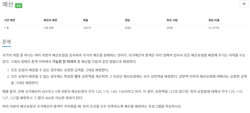 다른 이분 탐색 문제들 보다는 쉬웠던 것 같다. 예산 상한액을 정해놓고 넘지 않도록 상한액 보다 큰 예산은 무조건 상한액으로 줄이고, 그보다 작은 예산은 지원한다고 가정해서 가장 예산에 가깝도록 배정하는 금액을 찾아야 하는 문제이다. 이 문제는 딱 이분탐색 기준을 상한액으로 두면 될 것 같아서 쉬웠음.