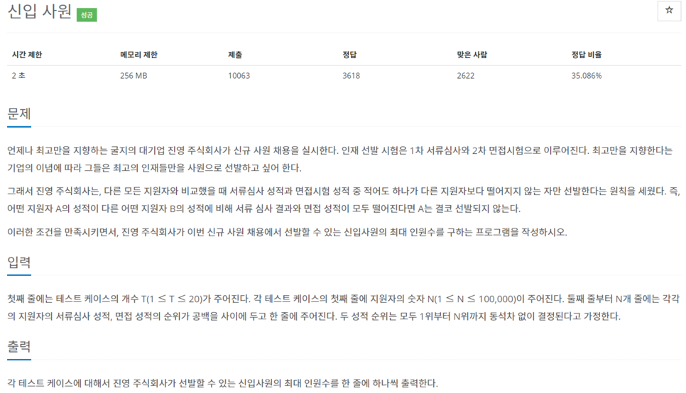 첫째 줄에는 테스트 케이스의 개수 T(1 ≤ T ≤ 20)가 주어진다. 각 테스트 케이스의 첫째 줄에 지원자의 숫자 N(1 ≤ N ≤ 100,000)이 주어진다. 둘째 줄부터 N개 줄에는 각각의 지원자의 서류심사 성