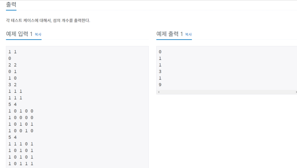 입력은 여러 개의 테스트 케이스로 이루어져 있다. 각 테스트 케이스의 첫째 줄에는 지도의 너비 w와 높이 h가 주어진다. w와 h는 50보다 작거나 같은 양의 정수이다. 둘째 줄부터 h개 줄에는 지도