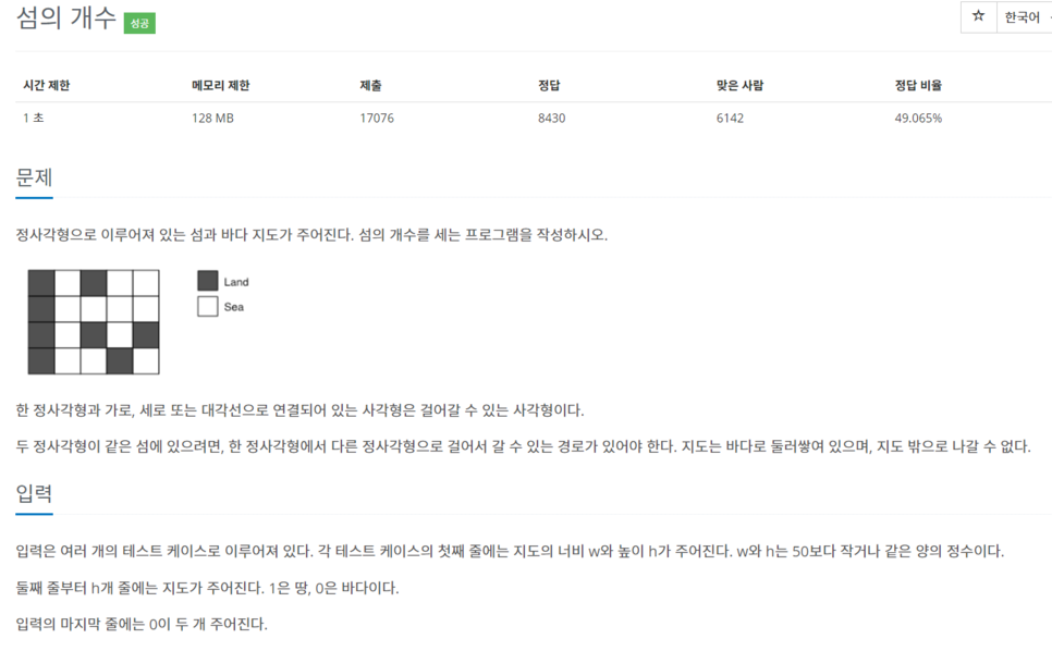 dfs 돌면서 섬의 개수 체크해 주면 된다. 이때, 대각선도 이동 가능하니까 dx, dy 배열의 방향을 8개로 해줘야한다.