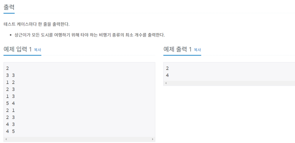 첫 번째 줄에는 테스트 케이스의 수 T(T ≤ 100)가 주어지고, 각 테스트 케이스마다 다음과 같은 정보가 주어진다. 첫 번째 줄에는 국가의 수 N(2 ≤ N ≤ 1 000)과 비행기의 종류 M(1 ≤ M ≤ 10 000) 가