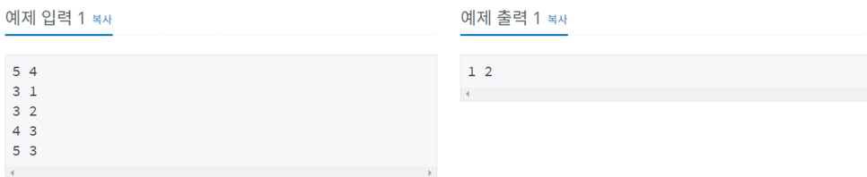 첫째 줄에, N과 M이 들어온다. N은 10,000보다 작거나 같은 자연수, M은 100,000보다 작거나 같은 자연수이다. 둘째 줄부터 M개의 줄에 신뢰하는 관계가 A B와 같은 형식으로 들어오며, "A가 B를 신뢰한
