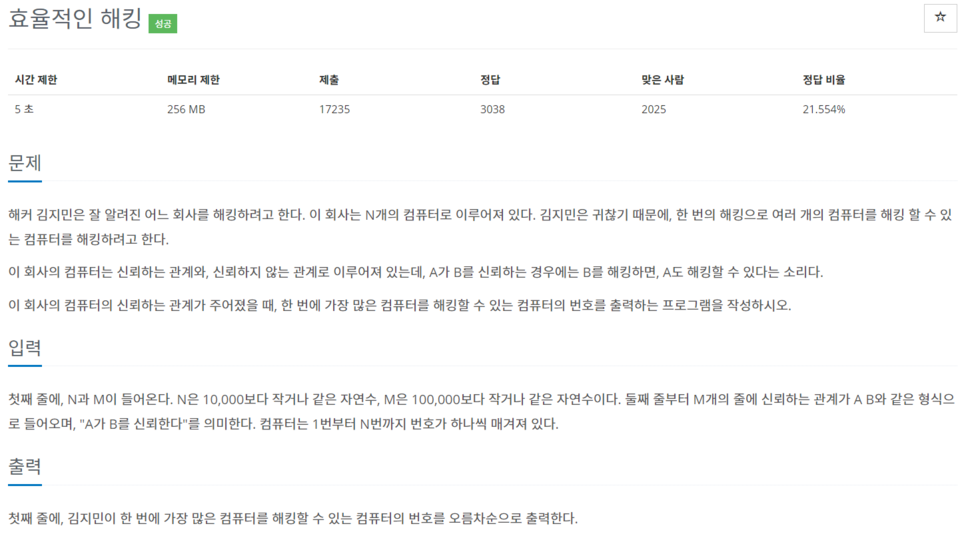 효율적인 해킹 이 문제도 전형적인 그래프 문제인데 작년에 풀다 실패했었다. 시간초과 나서