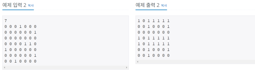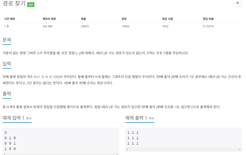 가중치 없는 방향 그래프 G가 주어졌을 때, 모든 정점 (i, j)에 대해서, i에서 j로 가는 경로가 있는지 없는지 구하는 프로그램을 작성하시오.