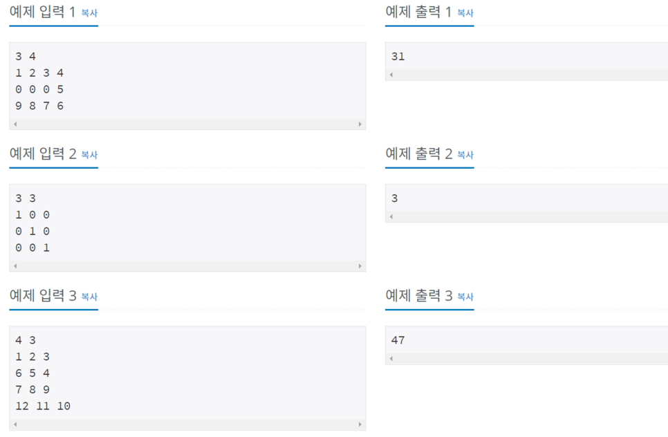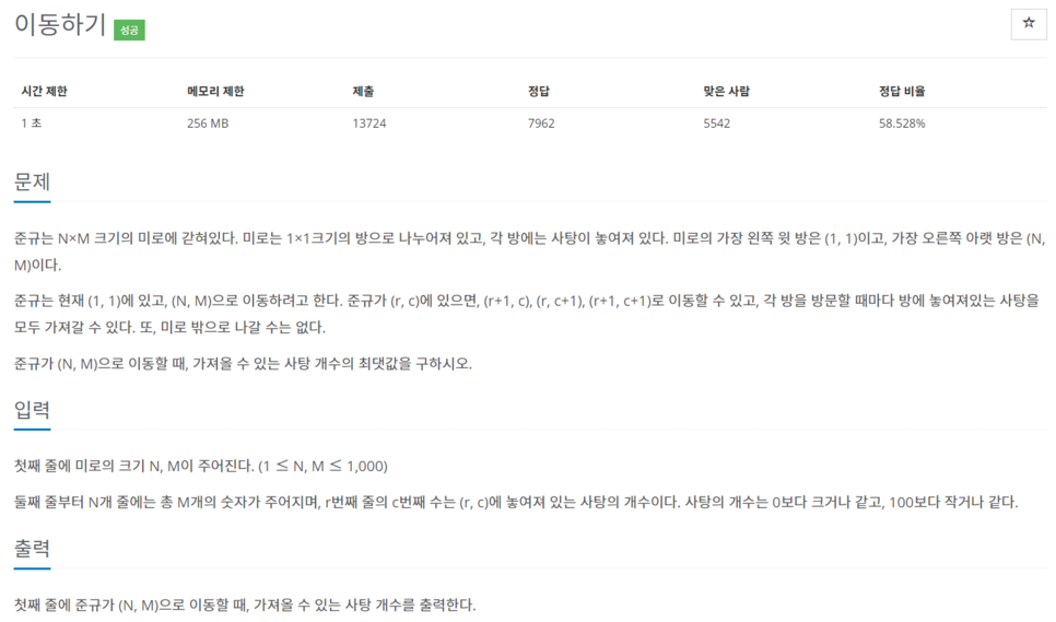 준규는 N×M 크기의 미로에 갇혀있다. 미로는 1×1크기의 방으로 나누어져 있고, 각 방에는 사탕이 놓여져 있다. 미로의 가장 왼쪽 윗 방은 (1, 1)이고, 가장 오른쪽 아랫 방은 (N, M)이다. 준규는