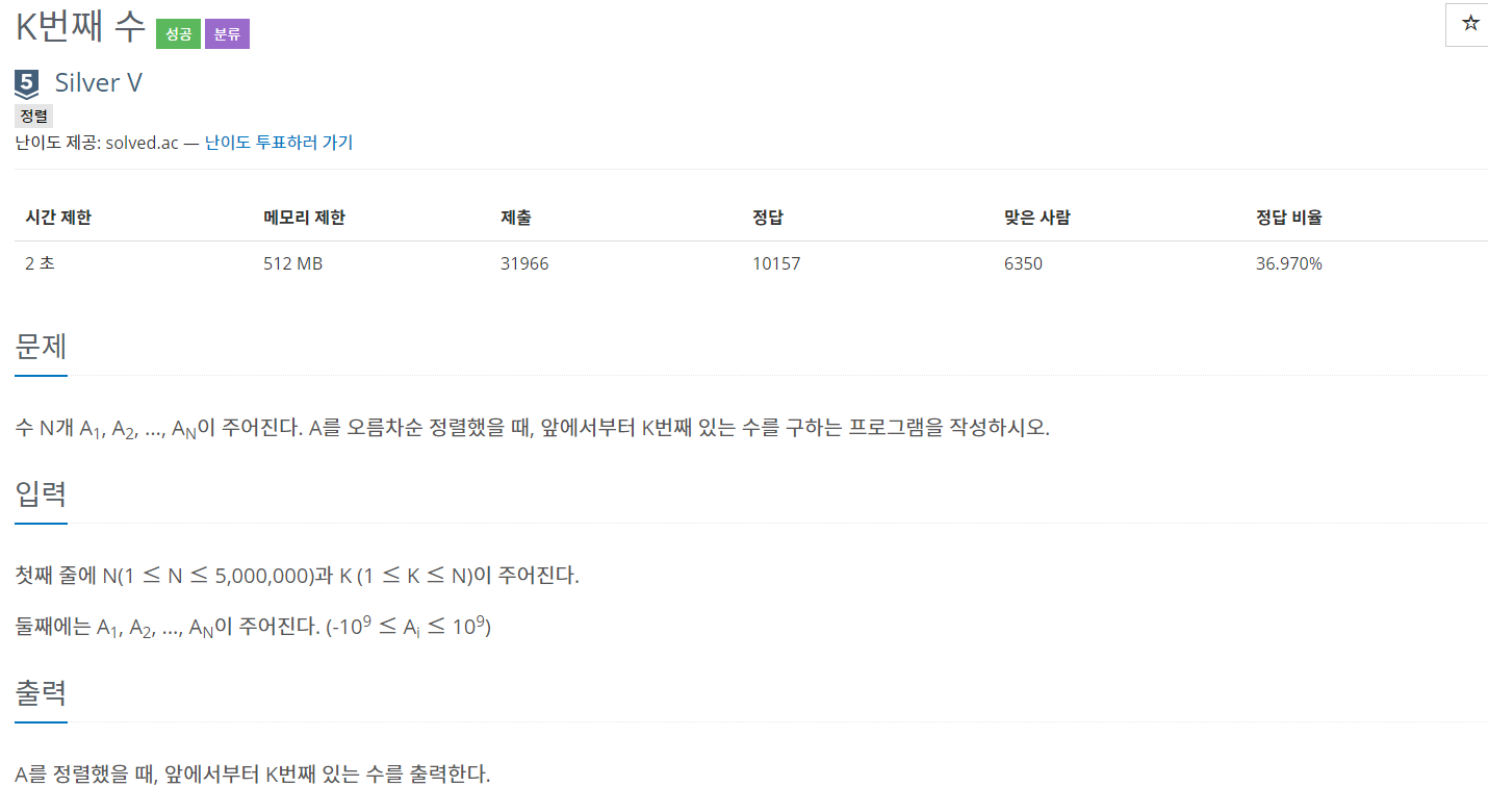 수 N개 A1, A2, ..., AN이 주어진다. A를 오름차순 정렬했을 때, 앞에서부터 K번째 있는 수를 구하는 프로그램을 작성하시오.