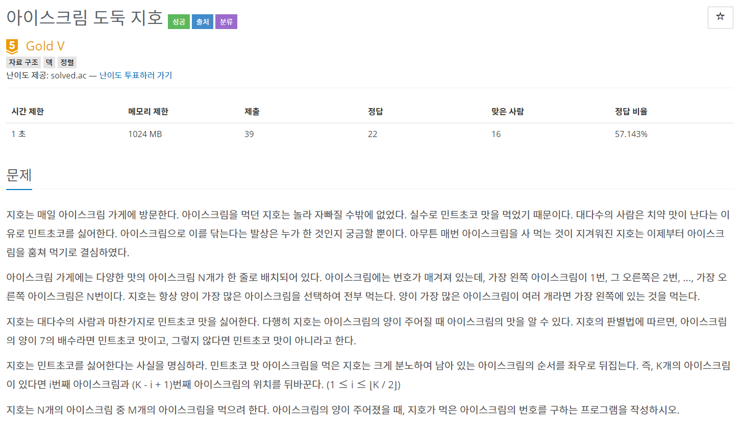사실 이 문제는 결국 양이 큰 아이스크림은 생각할 필요가 없이 그냥 먹으면 된다. 문제는 같은 양일때인데 양이 같으면 혹시나 민트초코를 먹었을 때 순서가 바뀌기 때문에 고려해주어야한다.