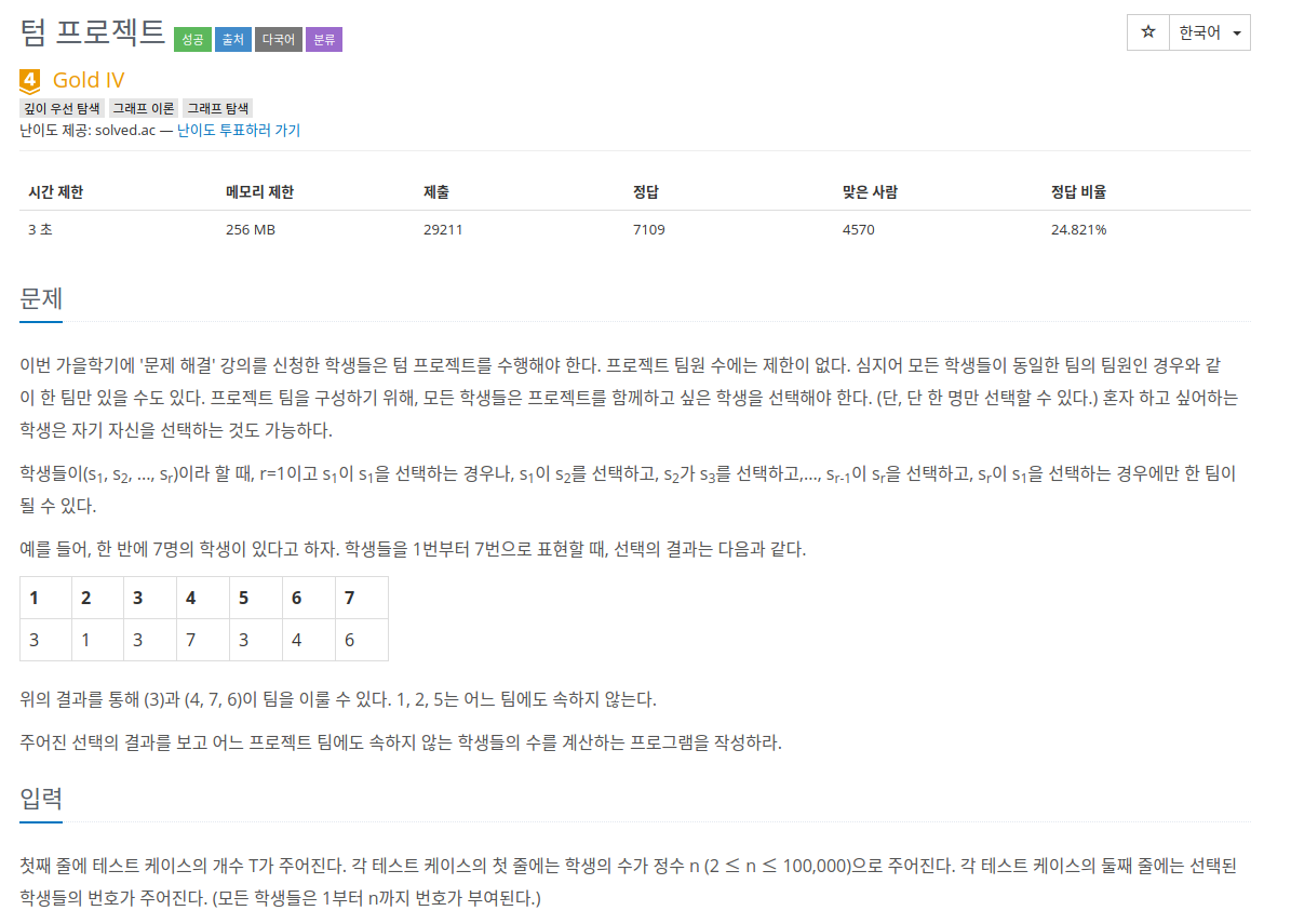 문제를 잘 읽어보면 결국 한 팀이 된다는건 4->7->6->4 이렇게 한팀 즉, 그래프로 생각했을 때 사이클이 만들어지면 한 팀이 되는 것이다.