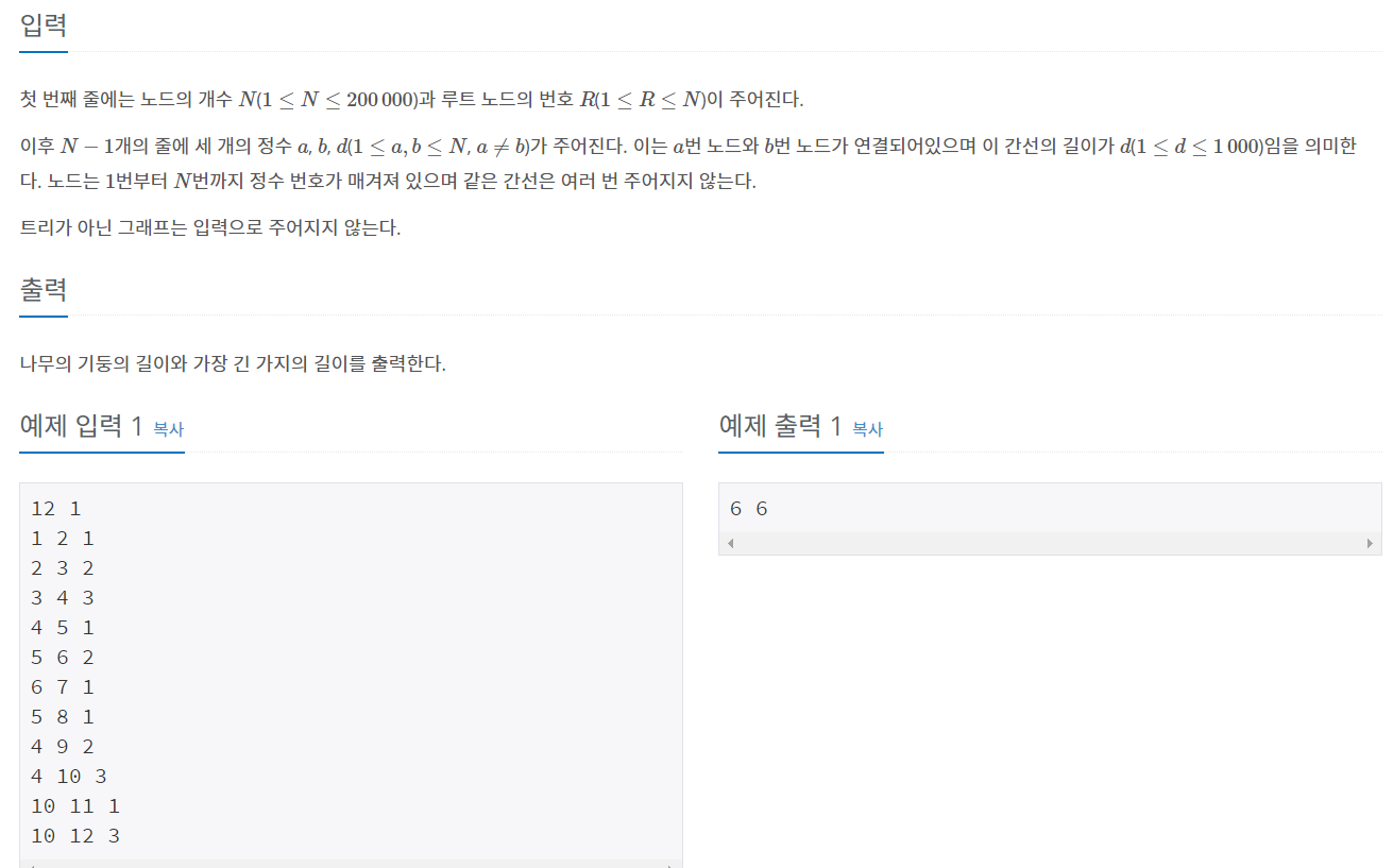 첫 번째 줄에는 노드의 개수 $N$($1 \le N \le 200\,000$)과 루트 노드의 번호 $R$($1 \le R \le N$)이 주어진다. 이후 $N-1$개의 줄에 세 개의 정수 $a$, $b$, $d$($1 \le a, b \le N$, $ a \ne b$)가 주어진다. 이는 $a$번