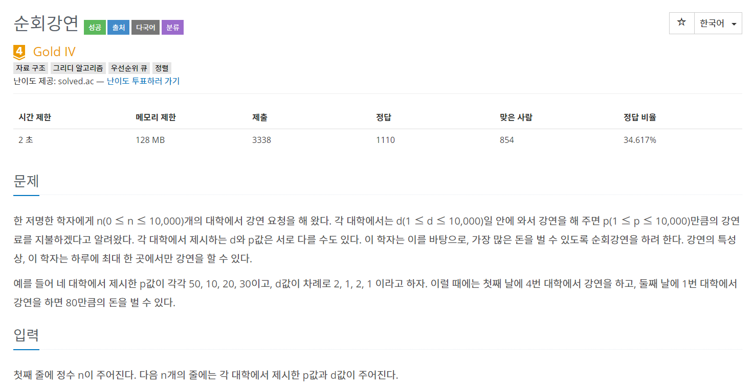 //BOJ 2109 순회강연
