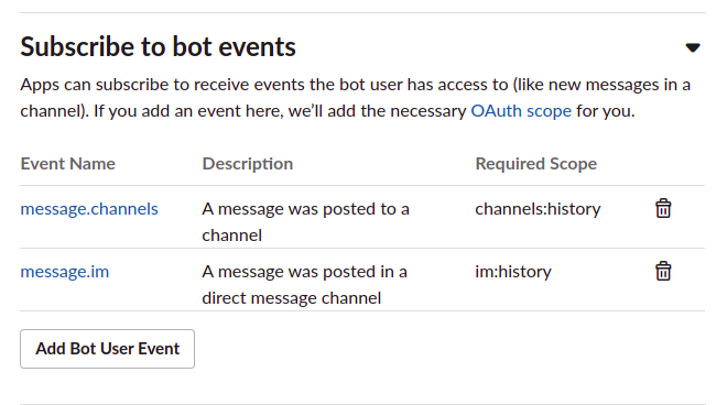 바로 아래에 Subscribe to bot events에 다음과 같이 추가해준다.