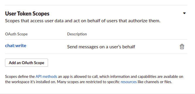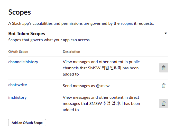 Scopes -> Bot Token Scopes 에서 Add an OAuth Scope버튼을 누르고 chat:write를 검색해 추가해준다.