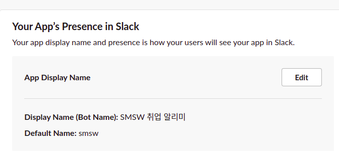 만약 초록불이 아니라면 Bots를 누르고 들어와서 이곳에서 Edit을 눌러주고 Display Name 이랑 Default Name을 설정해주면 된다.