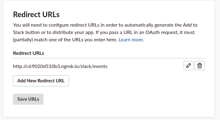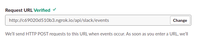 request URL에 슬랙 앱을 배포시킬 서버 주소를 넣으면 되는데 현재 테스트 용이니 저는 ngrok를 이용해
