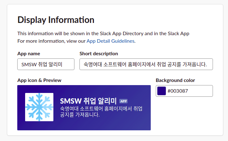 여기서 Bot User OAuth Token을 복사해서 우리 코드의 src/config/Bot.json 에 넣어준다.