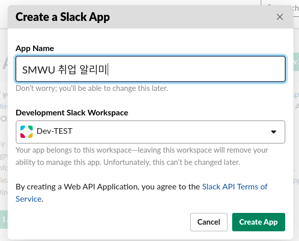 App name을 정하고, 개발용 workspace를 골라준다.