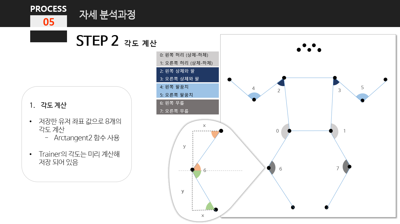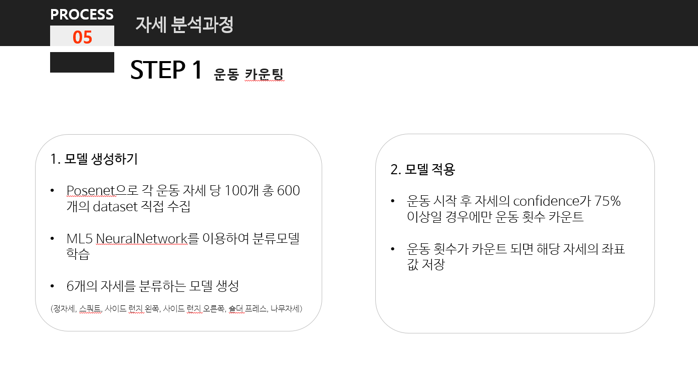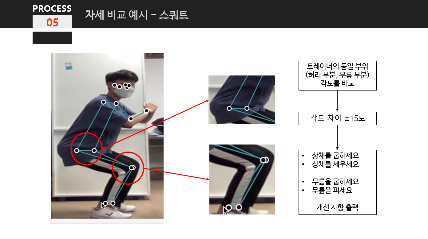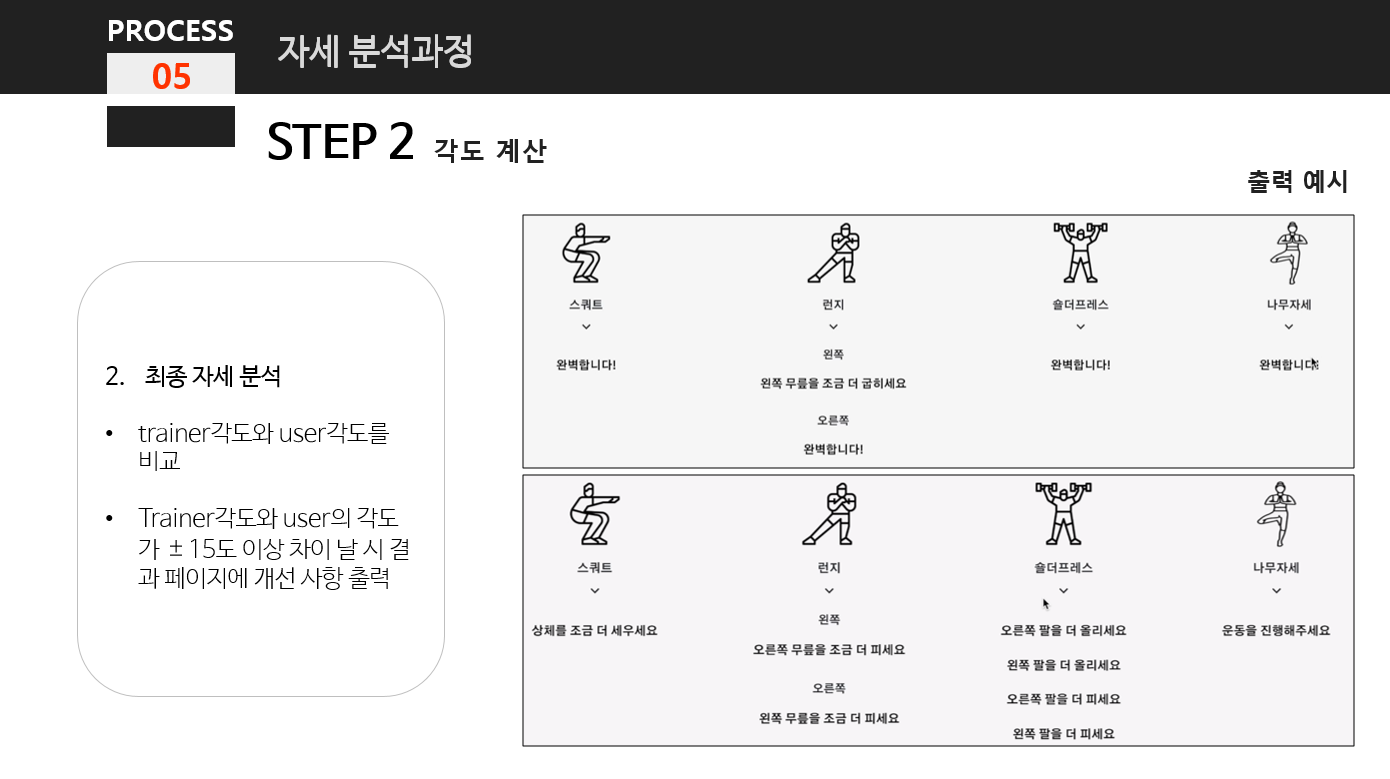 운동 자세를 판별해 카운팅하고 자세를 분석해서 트레이너의 각도와 비교해 개선사항을 보여준다.