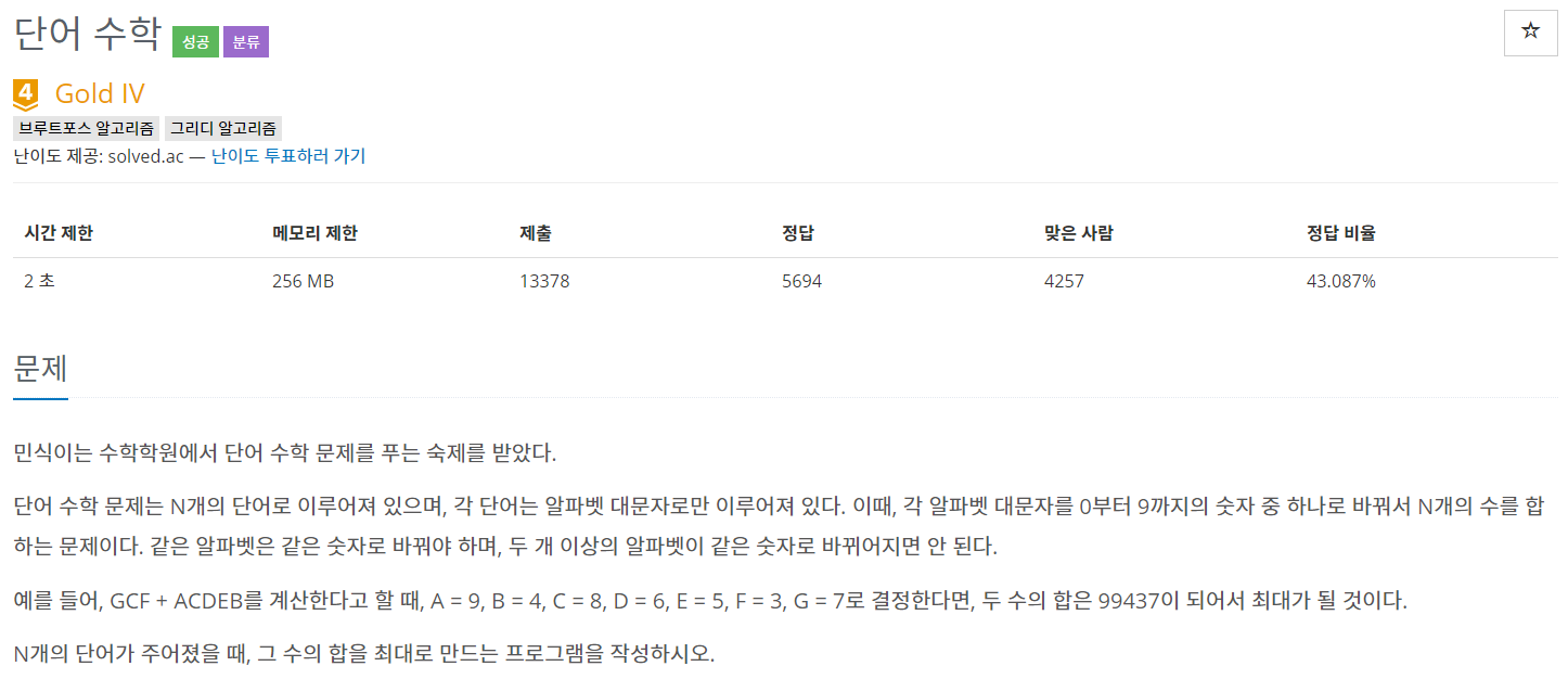 주어진 알파벳에 숫자를 부여하여 더할 때, 최댓값이 나오도록 해야하는 문제이다.