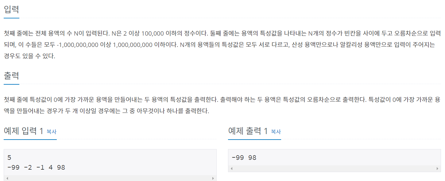 첫째 줄에는 전체 용액의 수 N이 입력된다. N은 2 이상 100,000 이하의 정수이다. 둘째 줄에는 용액의 특성값을 나타내는 N개의 정수가 빈칸을 사이에 두고 오름차순으로 입력되며, 이 수들은 모두 -