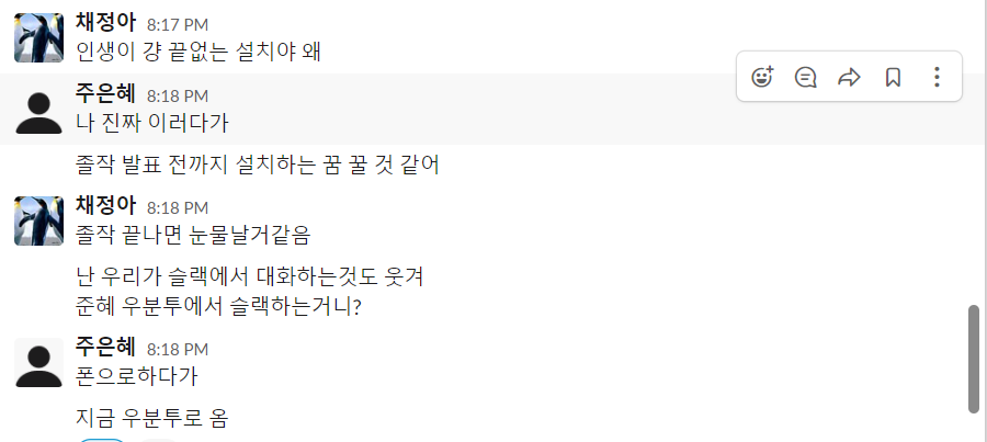 - 졸업작품으로 정말 정말 바빴다. 아침에 일어나면 학교로 갔고, 은혜랑 시원이를 만나서 하루종일 개발만 했다.