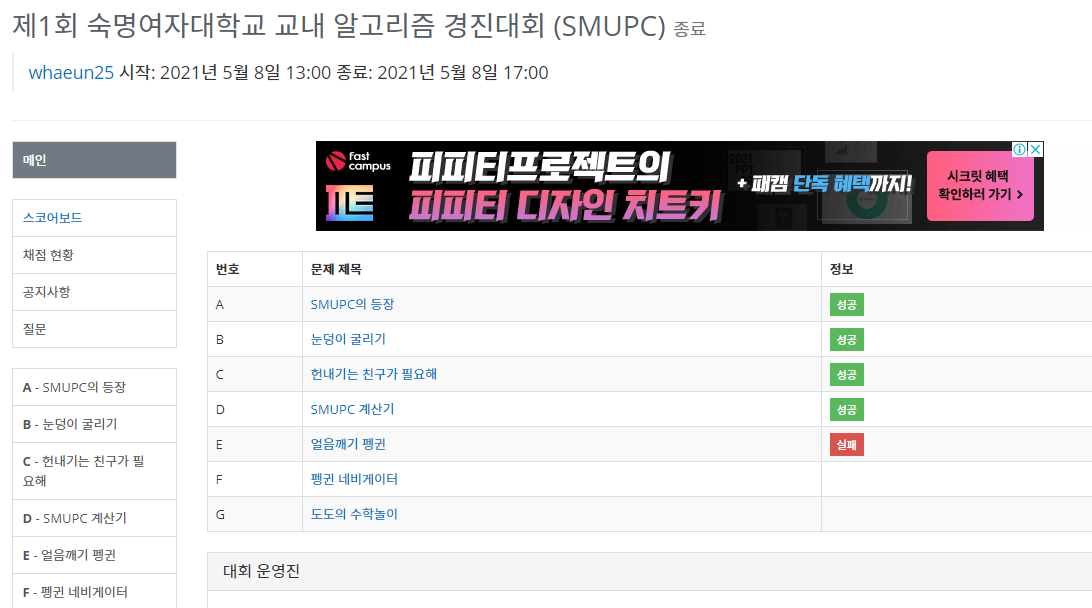 제1회 숙명여자대학교 교내 알고리즘 경진대회 (SMUPC)