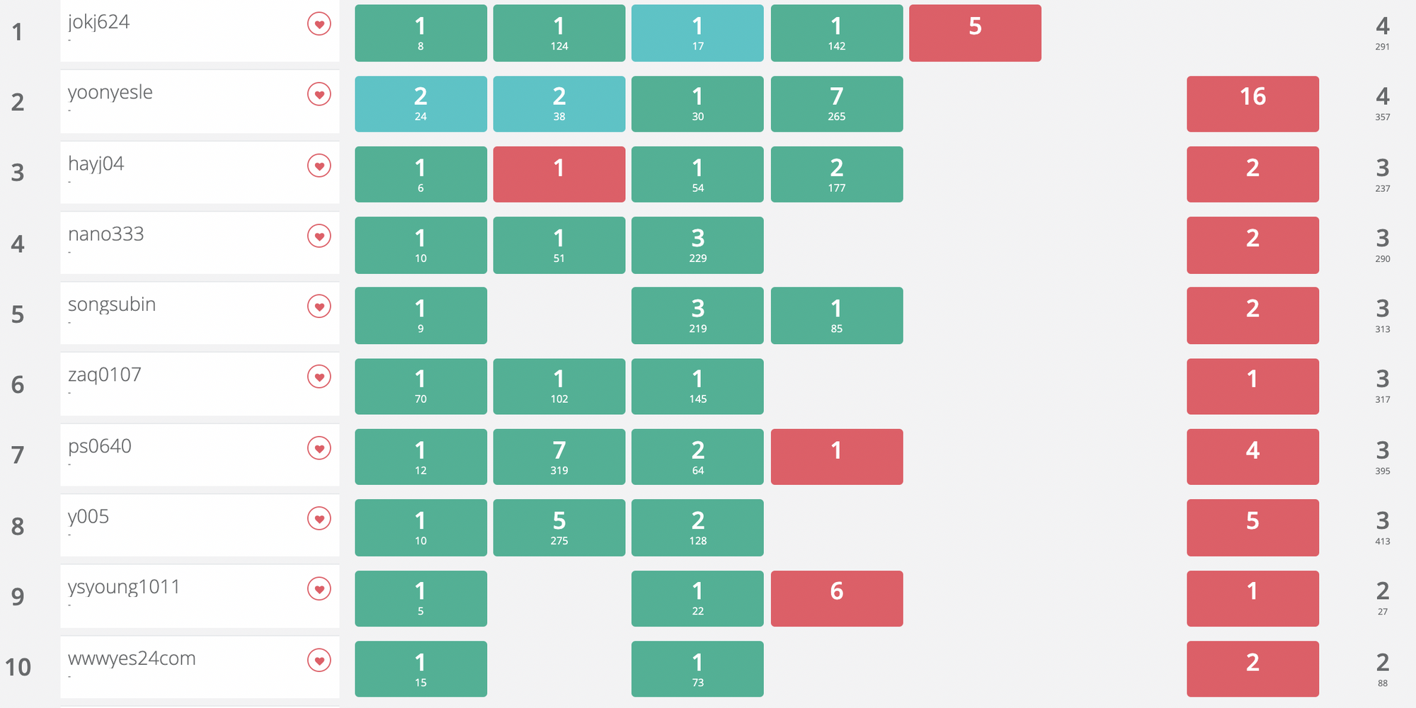 어차피 제가 남들보다 유력하게 2~3문제를 더 풀 것 같지도 않고, 저랑 비슷하게 푸는 분이 많을테니 차라리 한문제 한문제 패널티를 받지 말자가 목표였습니다. 전략이 어느정도 먹혔네요.