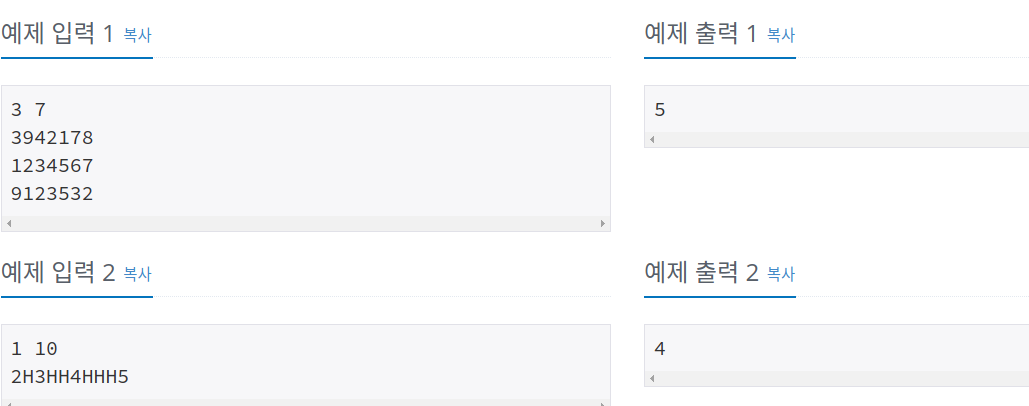 μ€μ 보λμ μΈλ‘ ν¬κΈ° Nκ³Ό κ°λ‘ ν¬κΈ° Mμ΄ μ£Όμ΄μ§λ€. μ΄ κ°μ λͺ¨λ 50λ³΄λ€ μκ±°λ κ°μ μμ°μμ΄λ€. λμ§Έ μ€λΆν° Nκ°μ μ€μ 보λμ μνκ° μ£Όμ΄μ§λ€. μ°μ¬ μλ μ«μλ 1λΆν° 9κΉμ§μ μμ°μ λλ