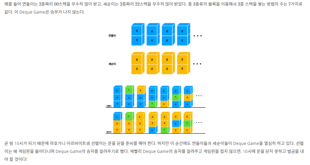 ๊ฒ์ 1 ์ฐ๋์ด๋ $19$๊ฐ์ง ๋ฐฉ์์ผ๋ก $3$์ธต ์คํ์ ๋ง๋ค ์ ์๊ณ , ์ธ์์ด๋ $1$๊ฐ์ง ๋ฐฉ์์ผ๋ก $3$์ธต ์คํ์ ๋ง๋ค ์ ์๋ค. ๋ฐ๋ผ์ ์ฐ๋์ด๊ฐ Deque Game์์ ์น๋ฆฌํ๋ค. ์ฐ๋์ด : $000, 001, 002, 010, 011, 012, 020