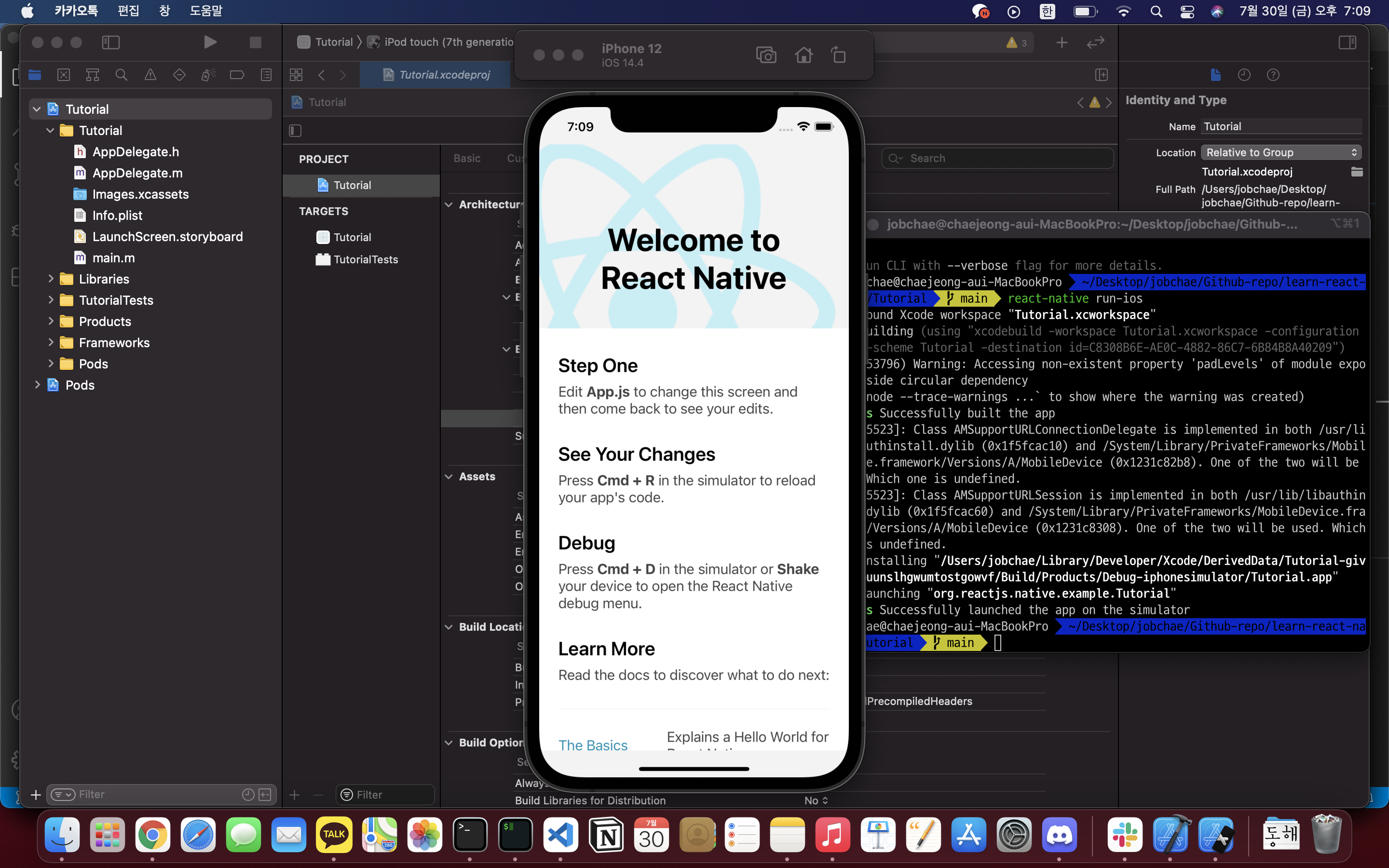 다시 pod install 후 react-native run-ios (프로젝트 루트 폴더에서) 실행 시
