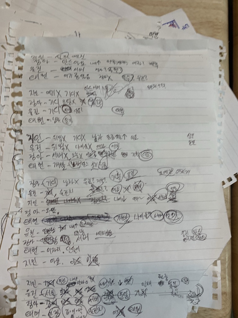 우리는 작업 중 갑자기 이 게임을 시작하더니 몇시간을 절겁게 두리또게임을 하며 보냈다. 두리또는 인물 관계가 중요한 게임이라 노트 필기를 하며 진행했는데 이때, 팀원들은 거의 고3 수능 필기보다 열심히 노트속에 인물 관계를 정립해나갔다.