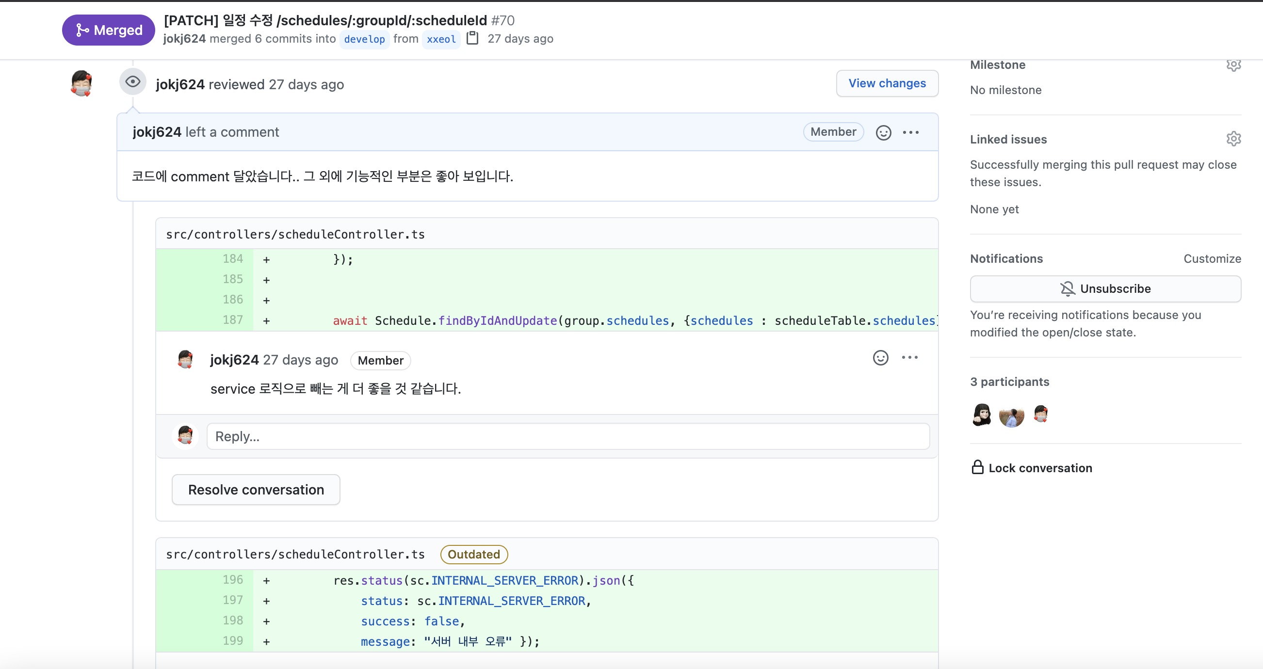 무튼 셋 다 PR 날리면 꼼꼼하게 봐줘서 무리없이 merge에 들어갈 수 있었다. 여기서 느낀건 나는 정말 꼼꼼하지 못하단 점.. 나도 다른 친구들의 code를 꼼꼼히 확인했는데 주현이나 설희가 내가 못본 부분을 바로바로 알아채서 comment를 남겨줬다. 내가 기능적인 부분을 우선시하게 점검해서 그런 것 같기도 하다. 자잘한 code style 문제들도 잘 확인해야겠단 생각이 들었다.