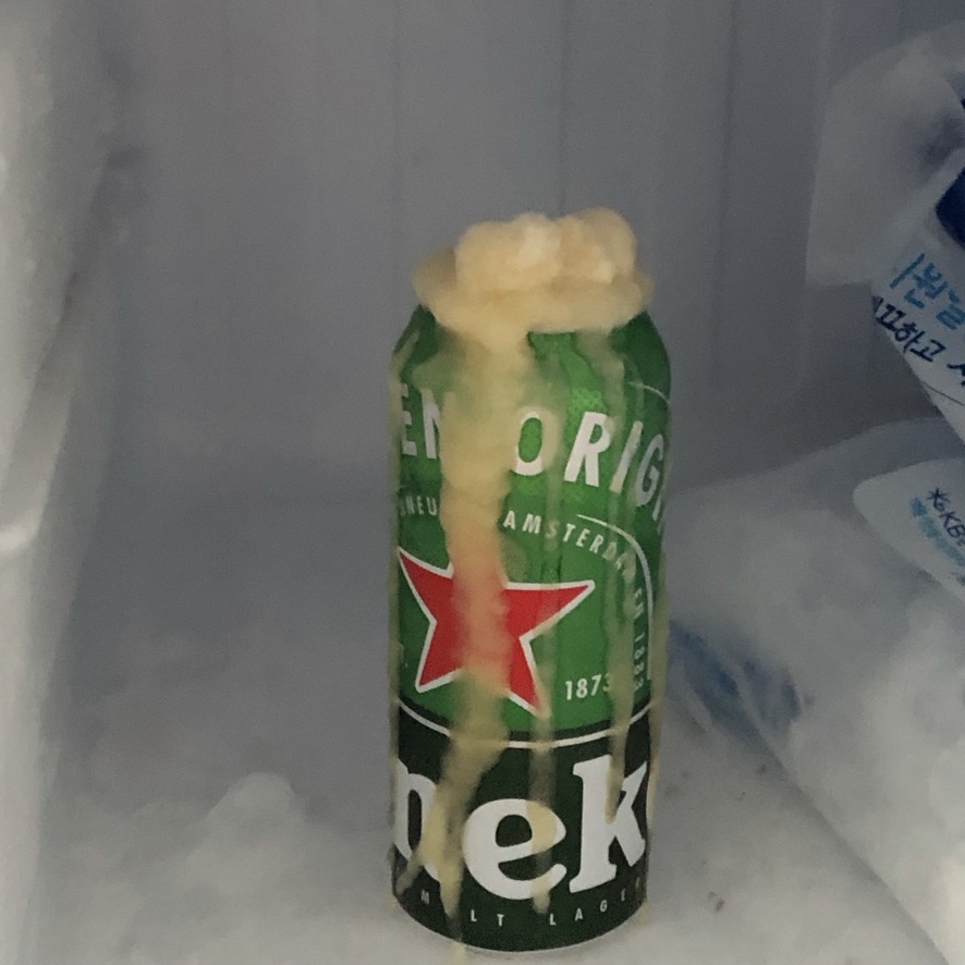 두번째 사진은 김xx씨가 본인이 시원하게 먹겠다며 냉동실에 넣어두고 그만 사라져 화산 폭발처럼 부풀어 오른 맥주사진이다.