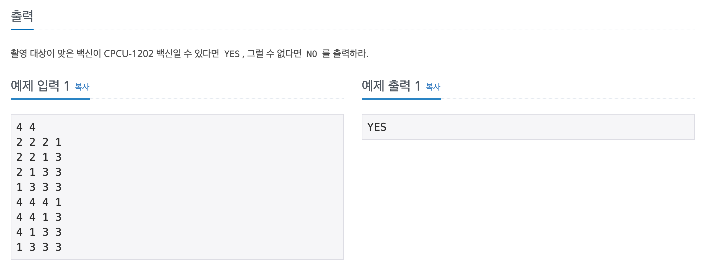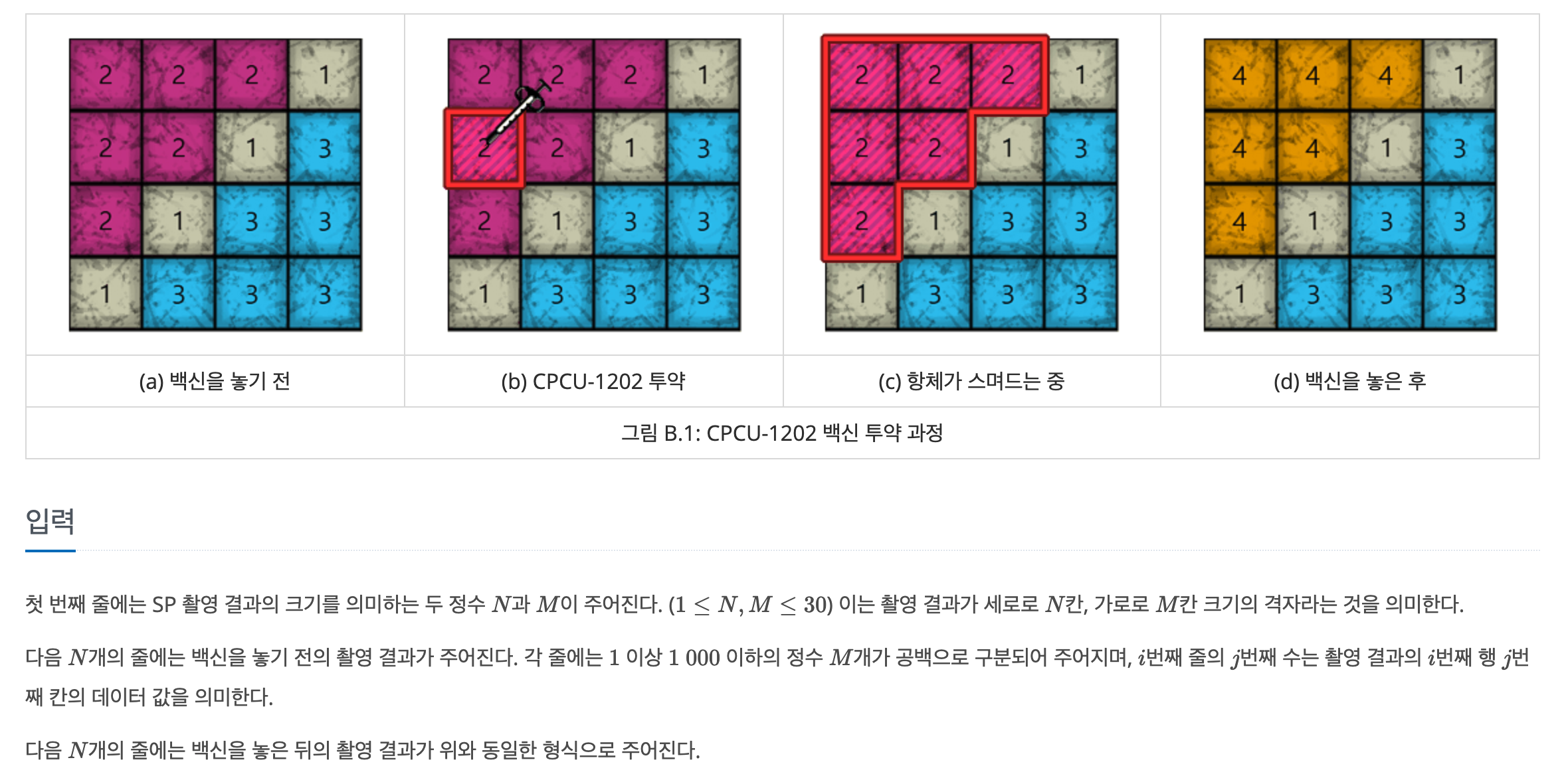 문제를 간략히 정리하면, 백신을 어느곳에 1회 투입하면 촬영후 사진에서는 투입한 위치와 상-하-좌-우 연결되어 있으면서 같은 값을 가지는 곳은 전부 다 어떤 임의의 값으로 변경되어 보인다. 이때 백신을 투약한 것이 맞는지 아닌지를 판단하는 문제이다.