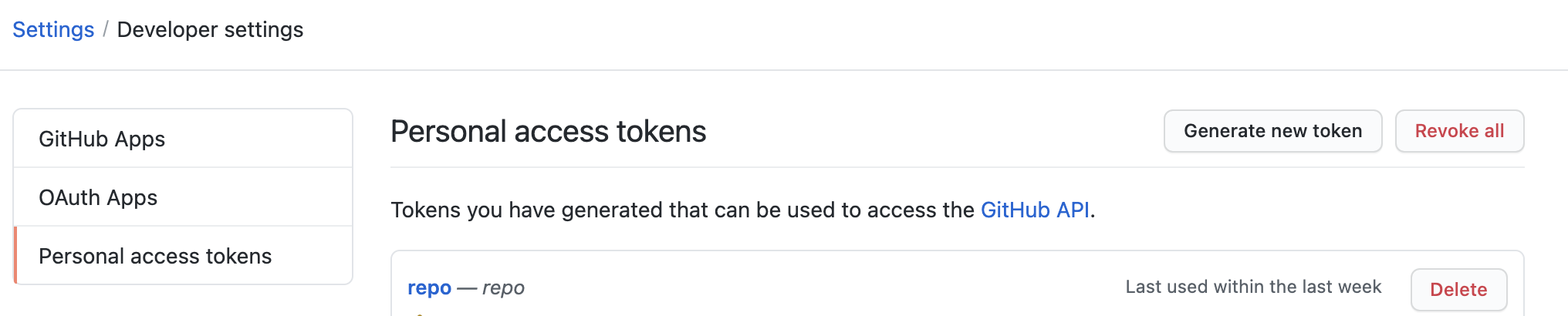 좌측에 있는 Personal access tokens를 들어가보면 이렇게 new token을 generate 할 수 있는 버튼이 존재한다.
