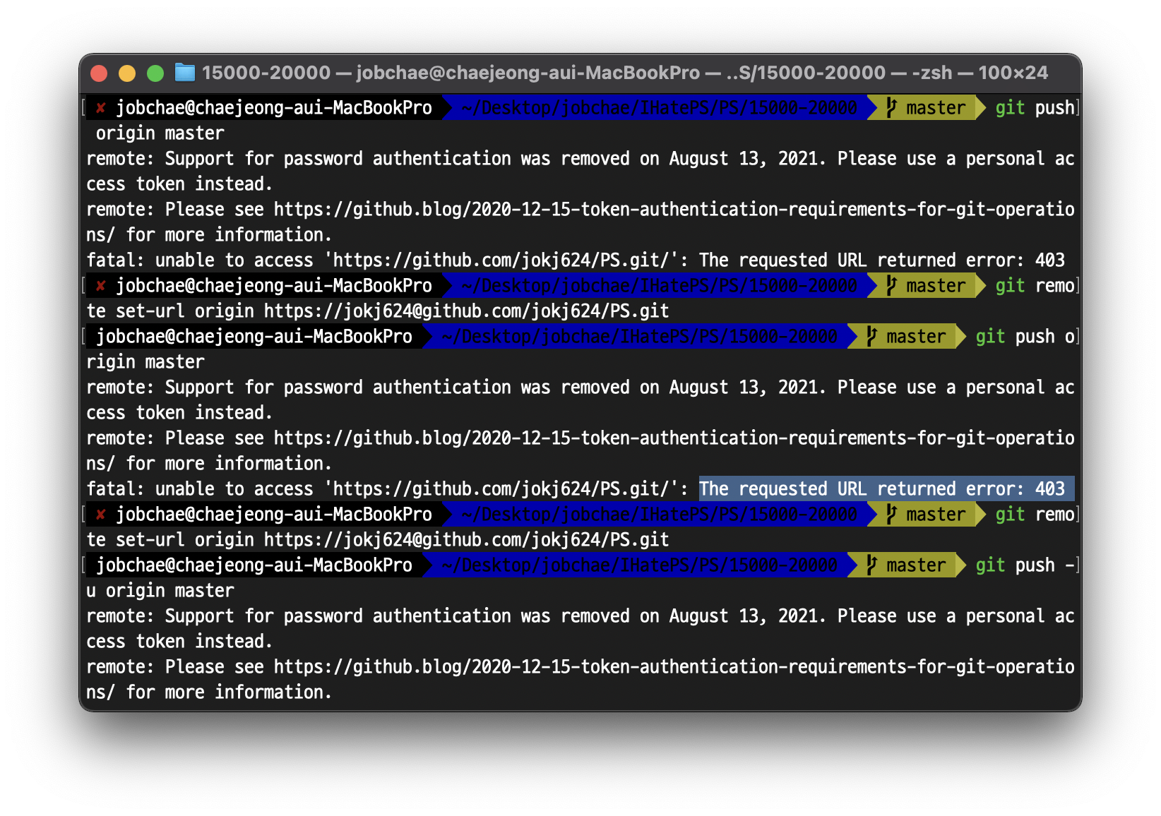 fatal: unable to access 'https://github.com/jokj624/PS.git/': The requested URL returned error: 403