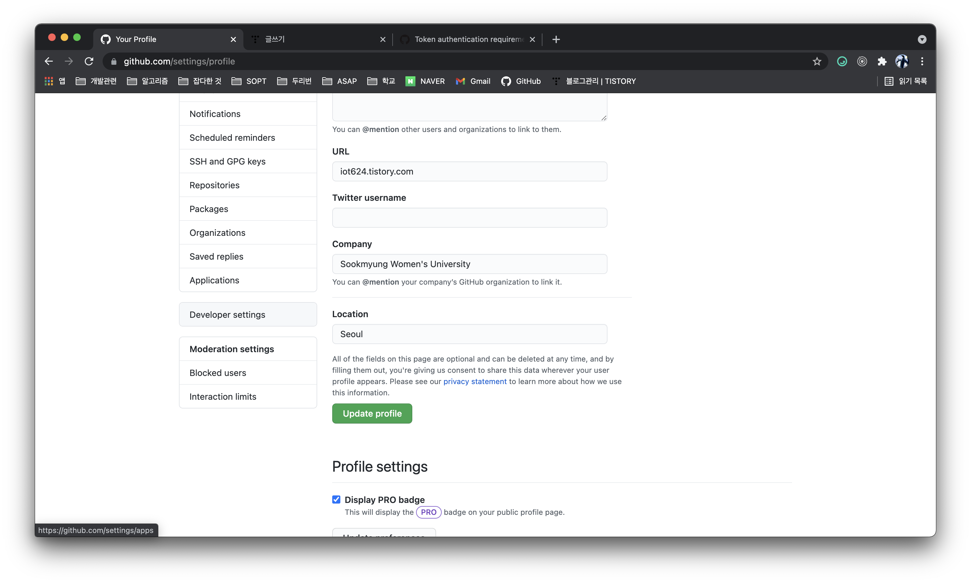 프로필 세팅 좌측 하단에 있는 developer settings 에 들어가보자.