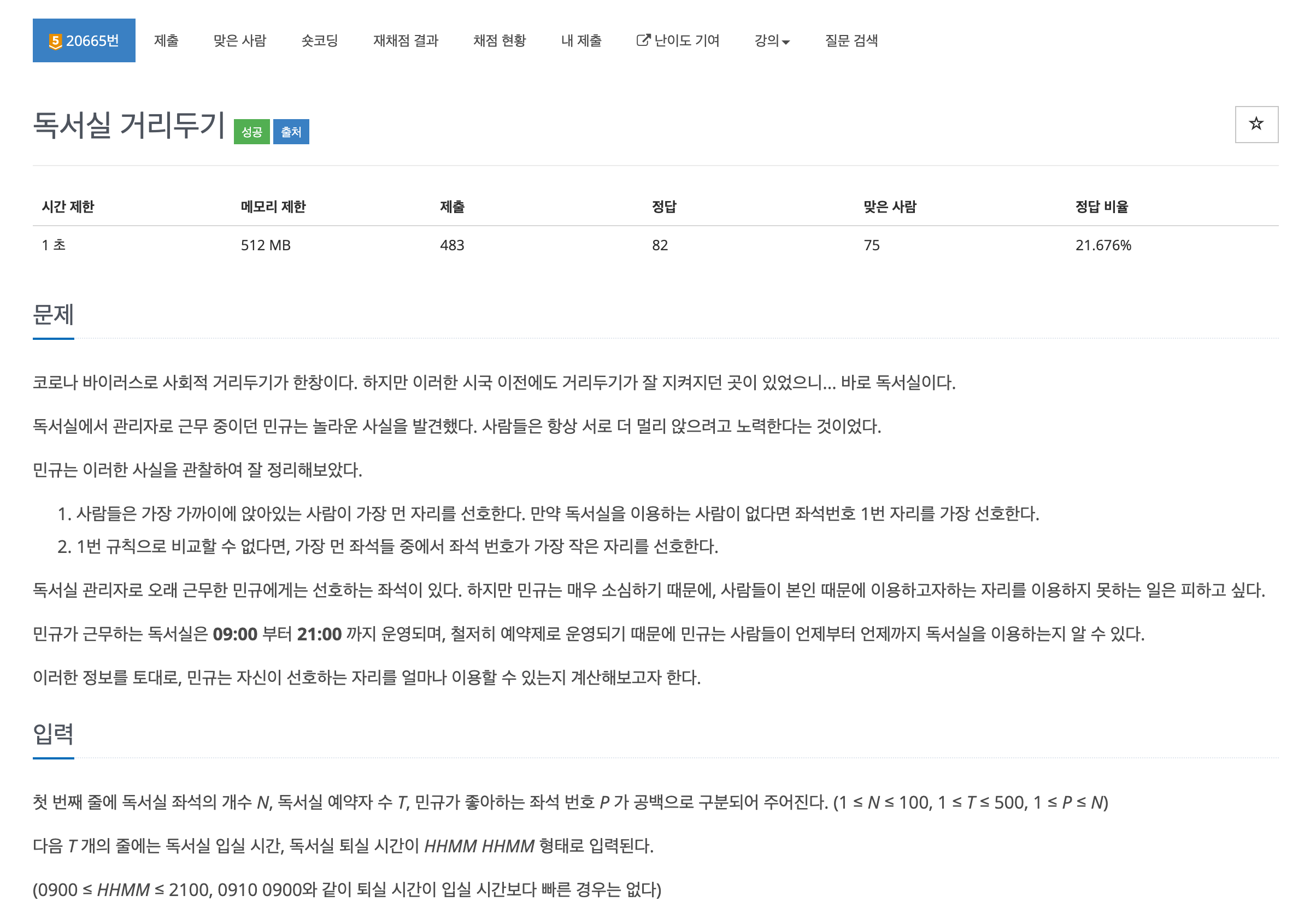 λ€μν νμ΄ λ°©λ²μ΄ μ‘΄μ¬ν κ² κ°μλ° λλ timetable[h][m][seat] 3μ°¨μ λ°°μ΄μ λ§λ€μ΄μ ν΄λΉμκ°μ ν΄λΉ seatμ μμ μλ μ¬λμ΄ μ‘΄μ¬νλ€λ©΄ 1λ‘ μ²΄ν¬νκ³ , λ§μ§λ§μ κ΄λ¦¬μκ° μμ μ μλ μ리λ₯Ό μ°Ύμ λλ timetable[h][m][P] κ°μ΄ 0μΌ λλ§λ€ 1λΆμ© μΆκ°ν΄μ€¬λ€.