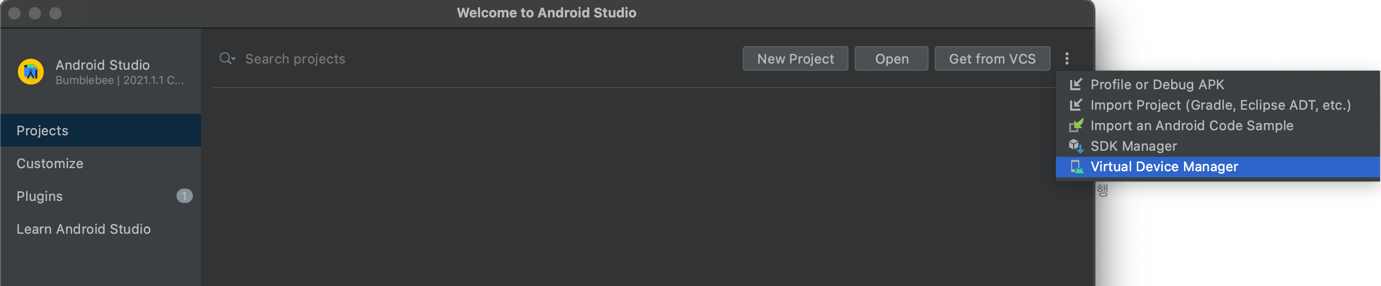 설치 완료 후 안드로이드 스튜디오 프리뷰 프로그램이 실행될 것이다. 첫 화면은 사실 이렇지 않았는데 난 이미 설치해서 이렇게 보인다. more action 이나 저런 점 3개 메뉴 버튼을 눌러보면 Virtual Device Manager 버튼이 나올 거다. 눌러주자.