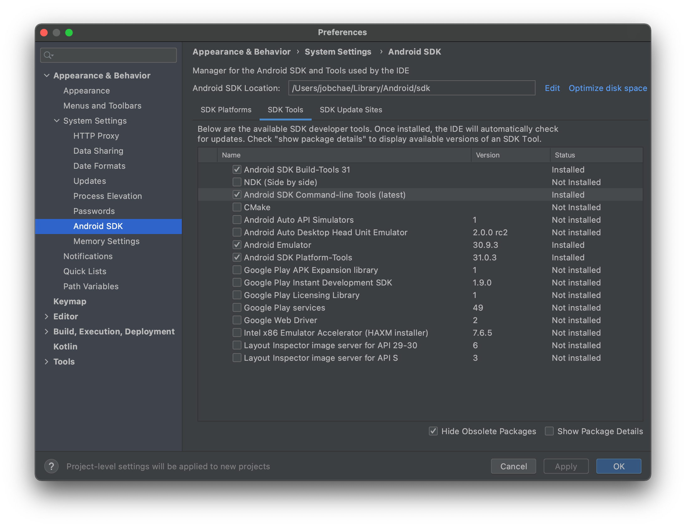 System Settings -> Android SDK -> SDK Tools -> Android SDK Command-line Tools 에 체크가 안되어있다면 바로 체크해준다. Apply 하여 적용해주면 된다.