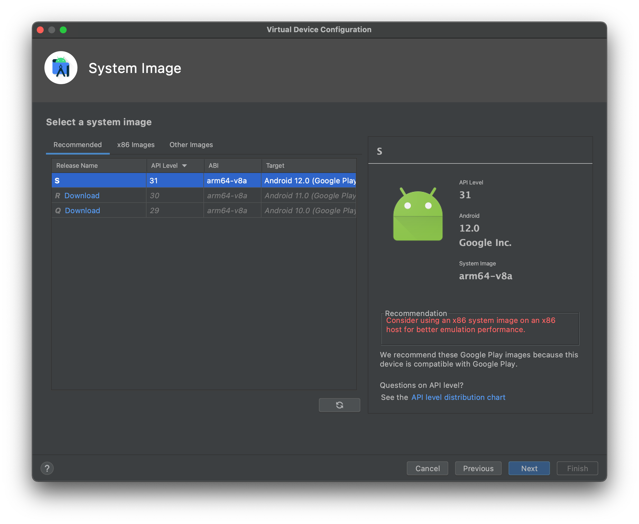 안드로이드 스튜디오가 M1 에서 안정화 되지 않았고 많은 이슈가 발생한다는 사실은 익히 들어 알고있었다. 그래서 iOS 시뮬레이터 먼저 시작한 것도 있음. 하지만 프로젝트 제출 시 안드로이드도 내야한다. 교수님이 주신 자료를 통해 시도하다가 인텔 맥 기반이길래 그냥 구글링해서 안드로이드 에뮬레이터를 돌리는데 성공했다. 가장 많이 참고한 블로그는 아래 참고 자료로 링크 걸어 두었으니 확인해주시면 된다.