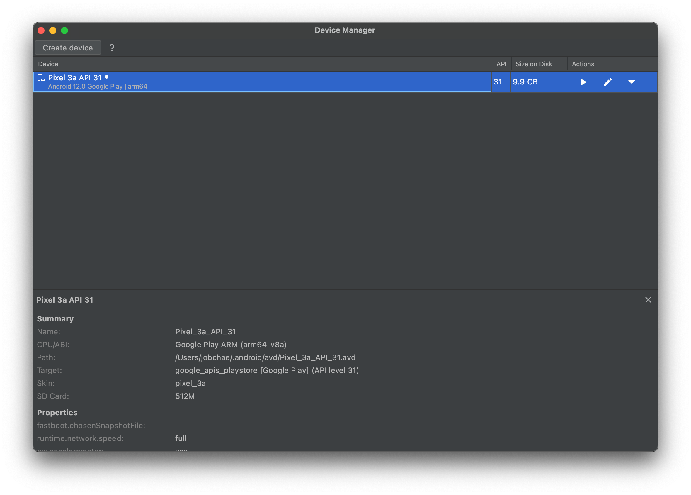 아까 설치한 Pixel 3a 옆에 보면 재생 버튼이 있다. 그걸 누르면 에뮬레이터가 정상적으로 켜진다.