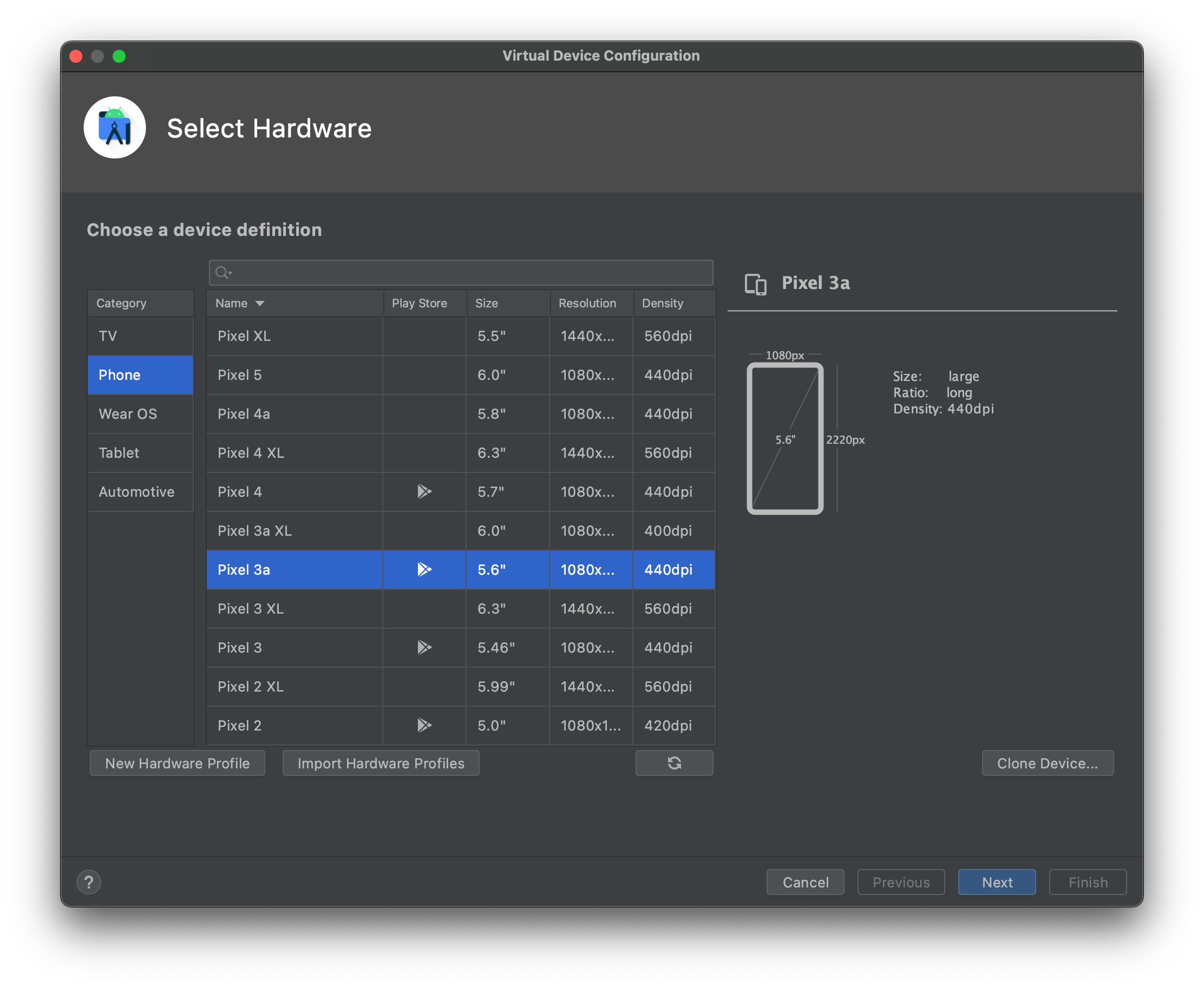 처음 설치했을 때는 당연히 아무 디바이스도 없을 것이다. 좌상단에 create device 버튼을 눌러보면 위와 같은 화면인 뜬다. 나는 교수님이 쓰시는 Pixel 3a 를 선택했다. next ㄱㄱ