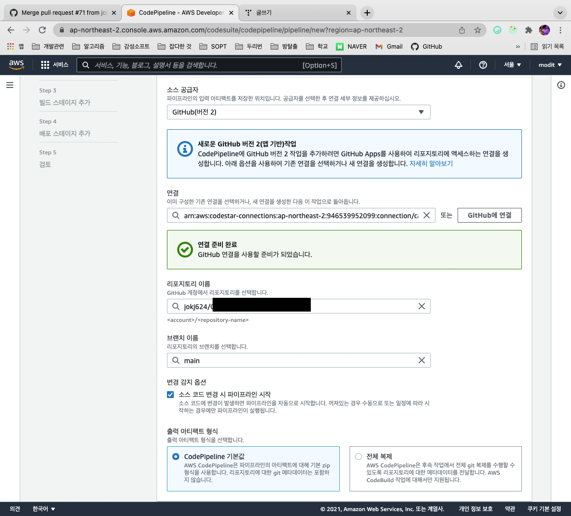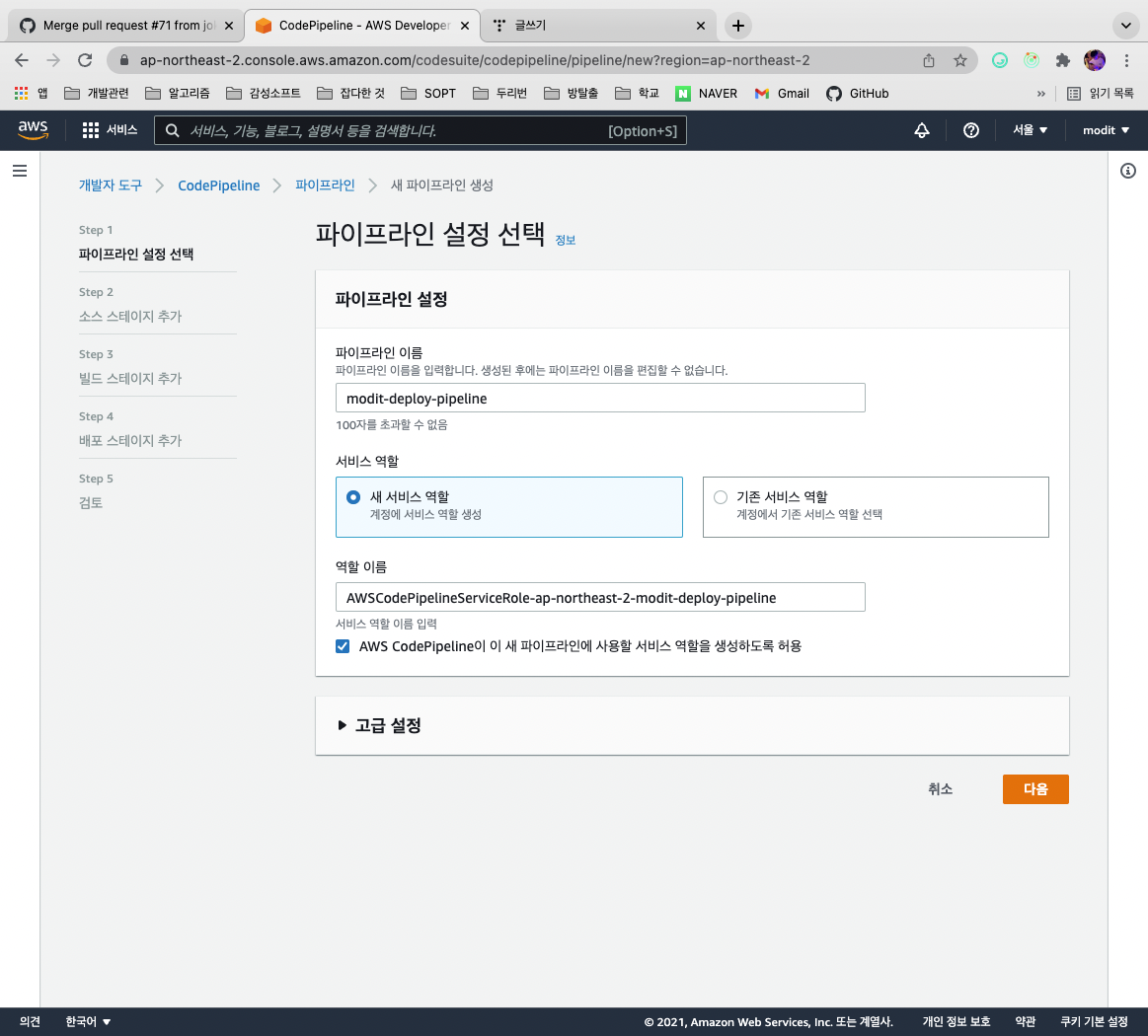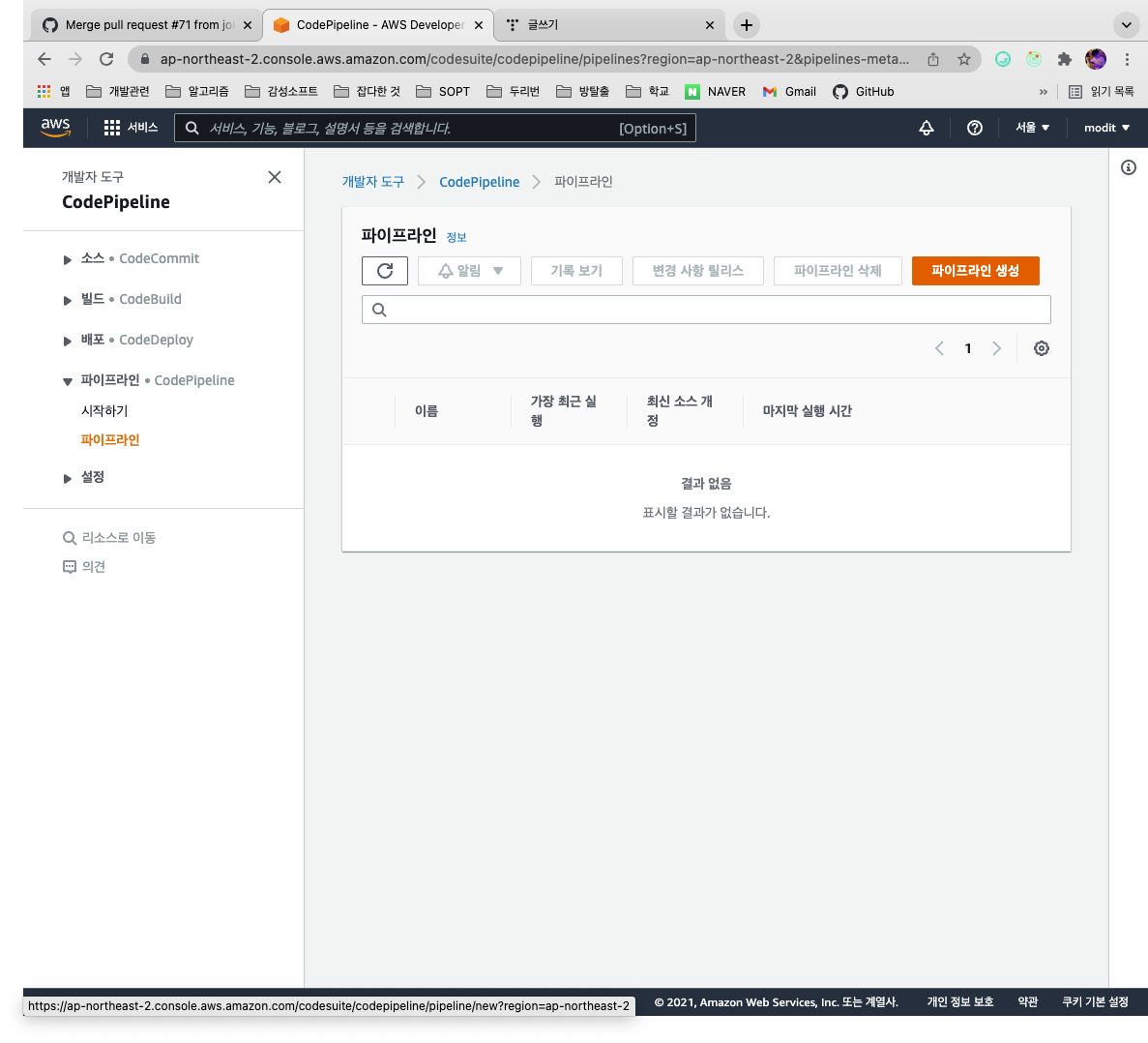 AWS CodePipeline ๋ฉ๋ด์ ๋ค์ด๊ฐ์ ํ์ดํ๋ผ์ธ ์์ฑ์ ๋๋ฌ์ค์๋ค.