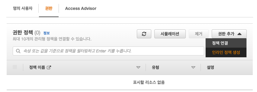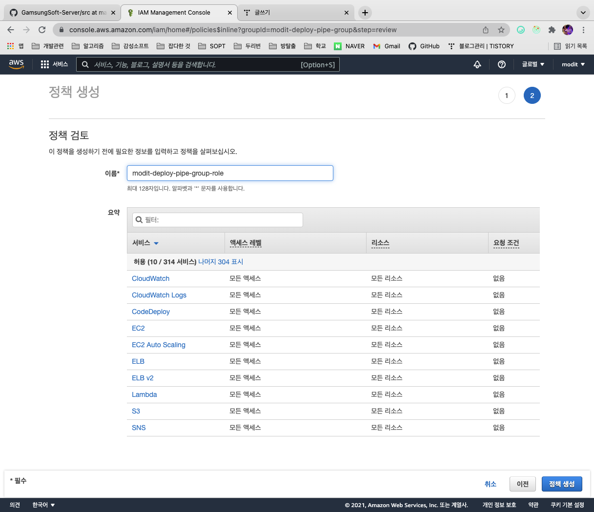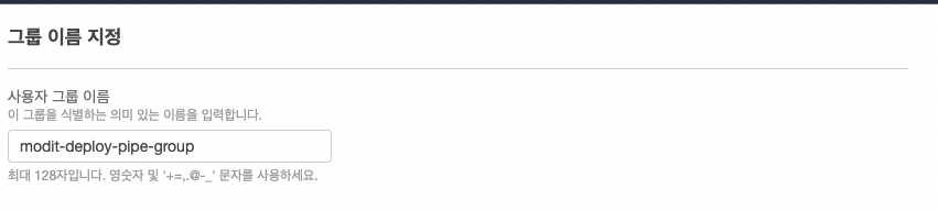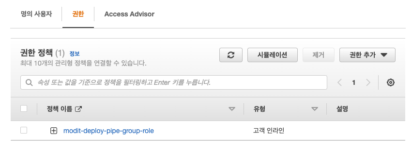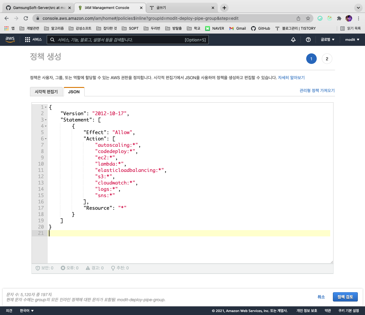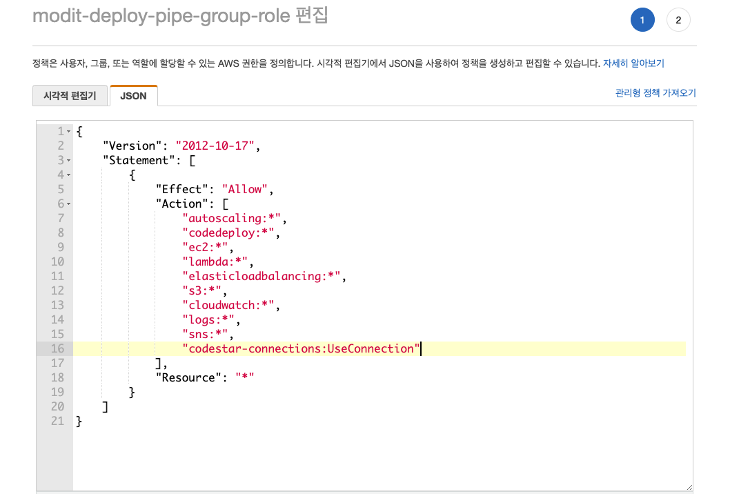 ์๊น ๋ง๋ IAM -> ์ฌ์ฉ์ ๊ทธ๋ฃน -> name-deploy-pipe-group-role์ ๊ฐ์ ์ ์ธ๋ผ์ธ ์ ์ฑ ์ ํธ์งํด์ค๋๋ค.