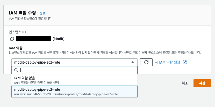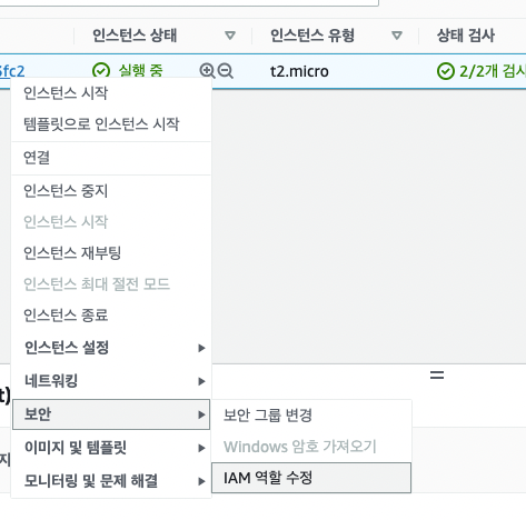 ec2 ๋์๋ณด๋๋ก ๋์ด์ ์ฌ์ฉํ ์ธ์คํด์ค์์ ์ค๋ฅธ์ชฝ ๋ฒํผ -> ๋ณด์ -> IAM ์ญํ ์์ ์ ๋๋ฌ์ค๋๋ค.