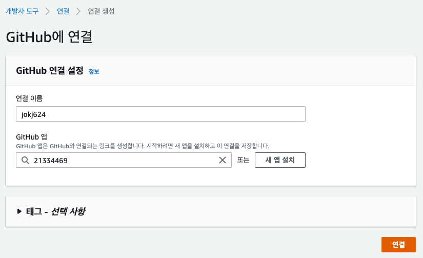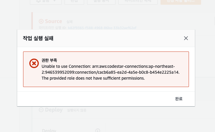 ์ด๋ผ๋ผ ? ์คํจํ์ต๋๋ค. ๊ตฌ๊ธ๋ง์ ํด๋ณด๋ group-role ์ ์ฑ ์ codestar-connections: UseConnection ์ ์ถ๊ฐํด์ค์ผํ๋ต๋๋ค.
