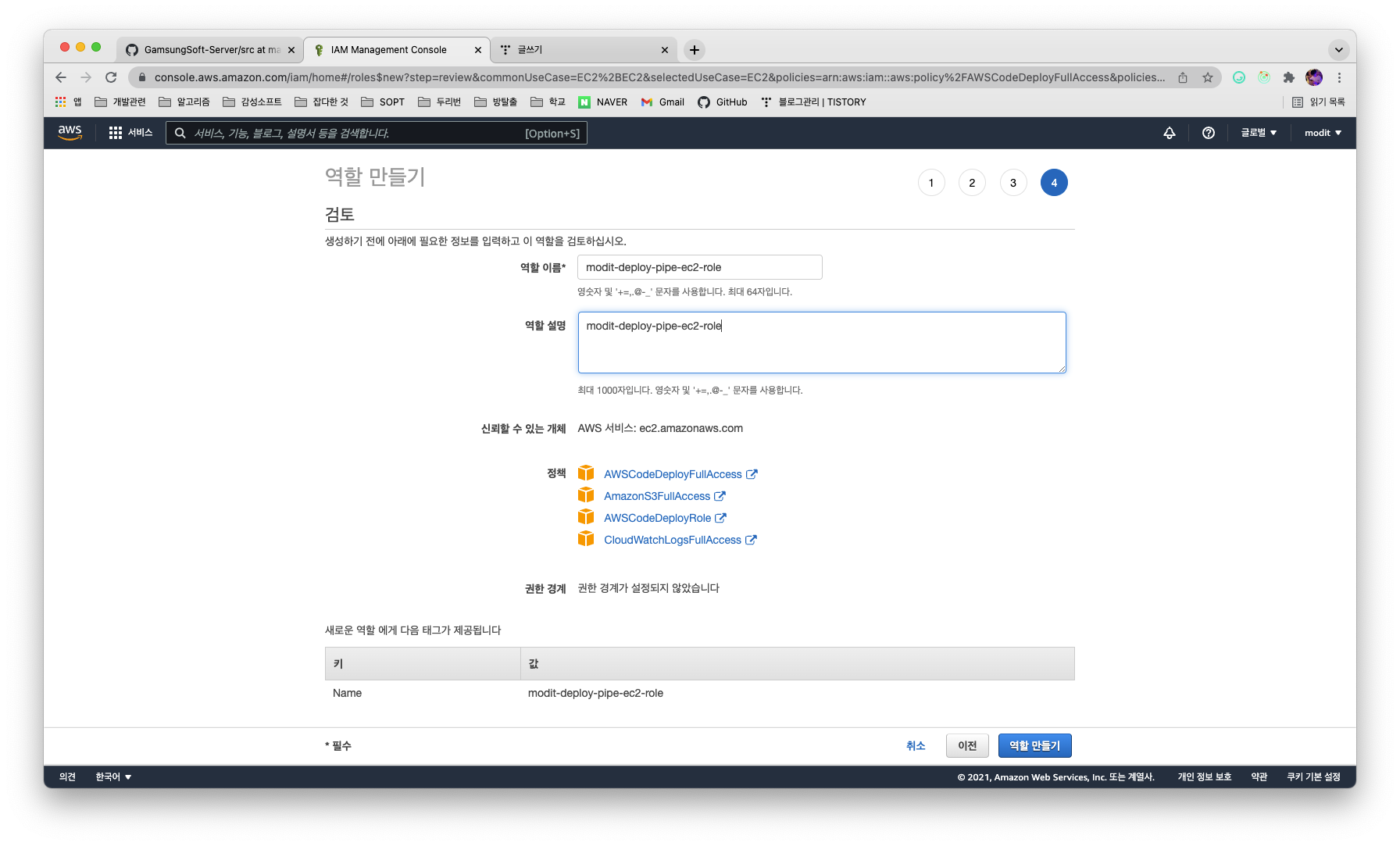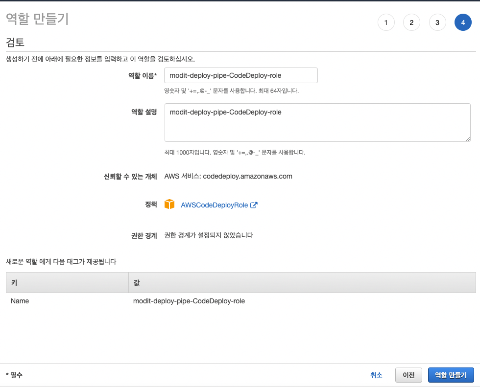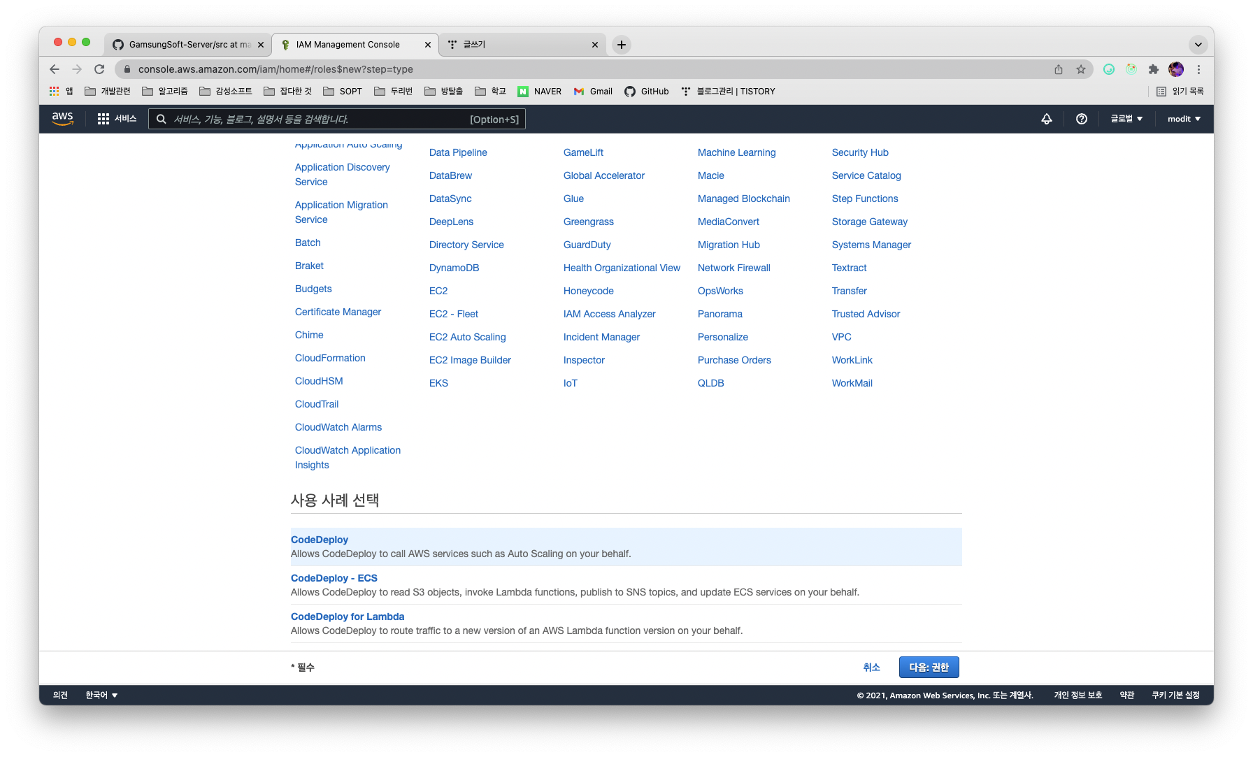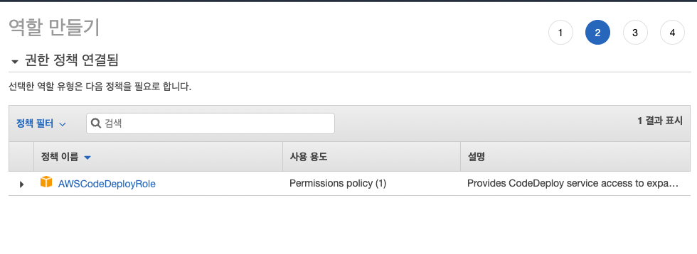 ec2์ ์ญํ ์ ์ ์ฉํ์ผ๋ CodeDeploy์๋ ์ญํ ์ ์ ์ฉํด์ผํฉ๋๋ค.
