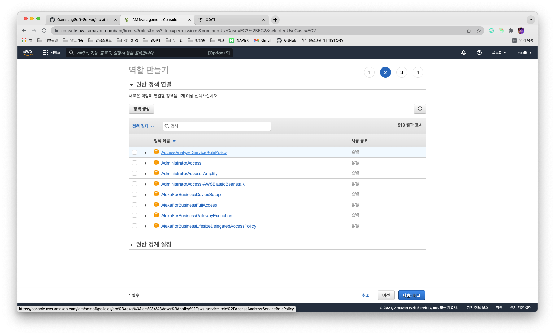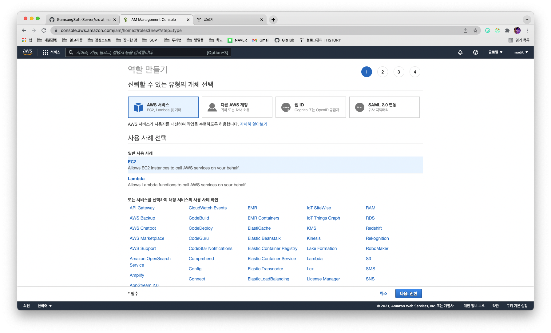 AWS IAM ์ ๋ค์ด๊ฐ ์ญํ ์ ๋๋ฅด๊ณ , ์ญํ ๋ง๋ค๊ธฐ๋ฅผ ํด๋ฆญํฉ๋๋ค.