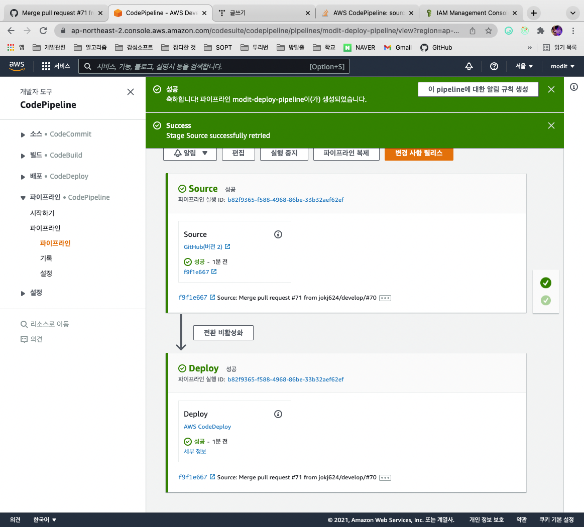 ์ด์ CodeDeploy์ CodePipeline์ ํตํด ๋ ํฌ์งํ ๋ฆฌ ์ฝ๋ ์์ ์ ์๋์ผ๋ก ec2์ ๋ฐ์์ด ๋ฉ๋๋ค.