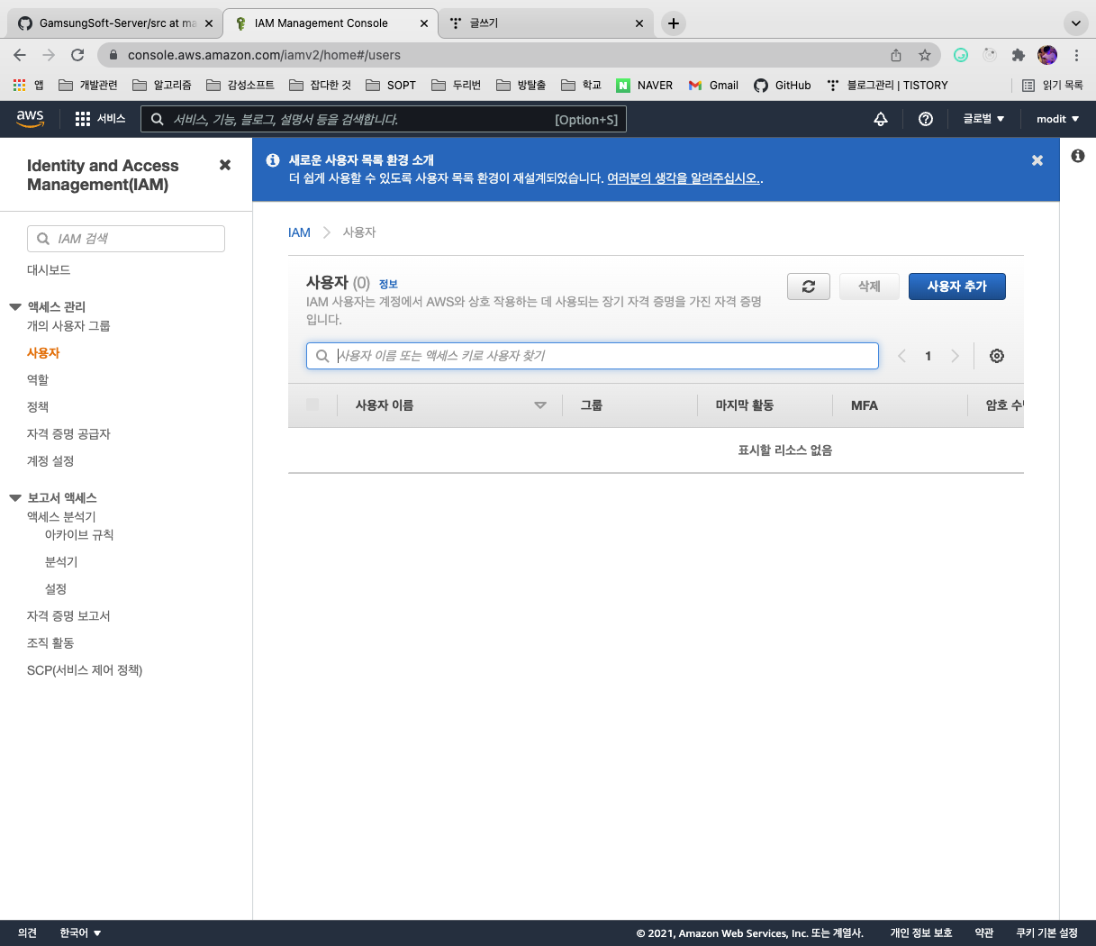 IAM ์ข์ธก ๋ฉ๋ด์์ ์ฌ์ฉ์ -> ์ฌ์ฉ์ ์ถ๊ฐ ๋ฅผ ํด๋ฆญํฉ๋๋ค.